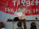 Sarah Prineas shared her book, The Magic Thief. This book is getting rave reviews by fans of Harry Potter. One of the neatest aspects of this book is that she had to invent a whole new language that is used in the book to give clues to the reader. A key is located in the back of the book to help decode the language. When she signed my copy, she left me a message in this code and I had to decode it when I got home.