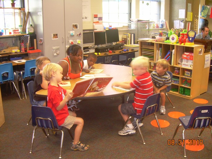 Published September 1, 2010 at 2272 × 1704 in What does it mean to read? 8-31 051 A parent volunteer picture walks with a group of students ← Previous