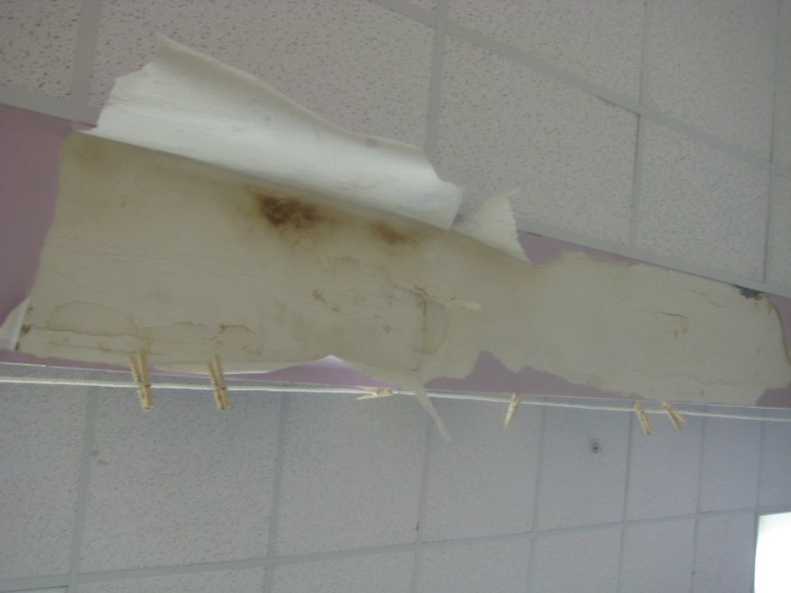 Published September 2, 2010 at 3072 × 2304 in Raindrops are Falling on Our Heads leak 005 Peeled back ceiling above the circulation desk ← Previous