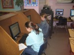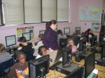 - A group of 5th graders with their teacher at tables and the computer lab writing scenarios for future problem solving