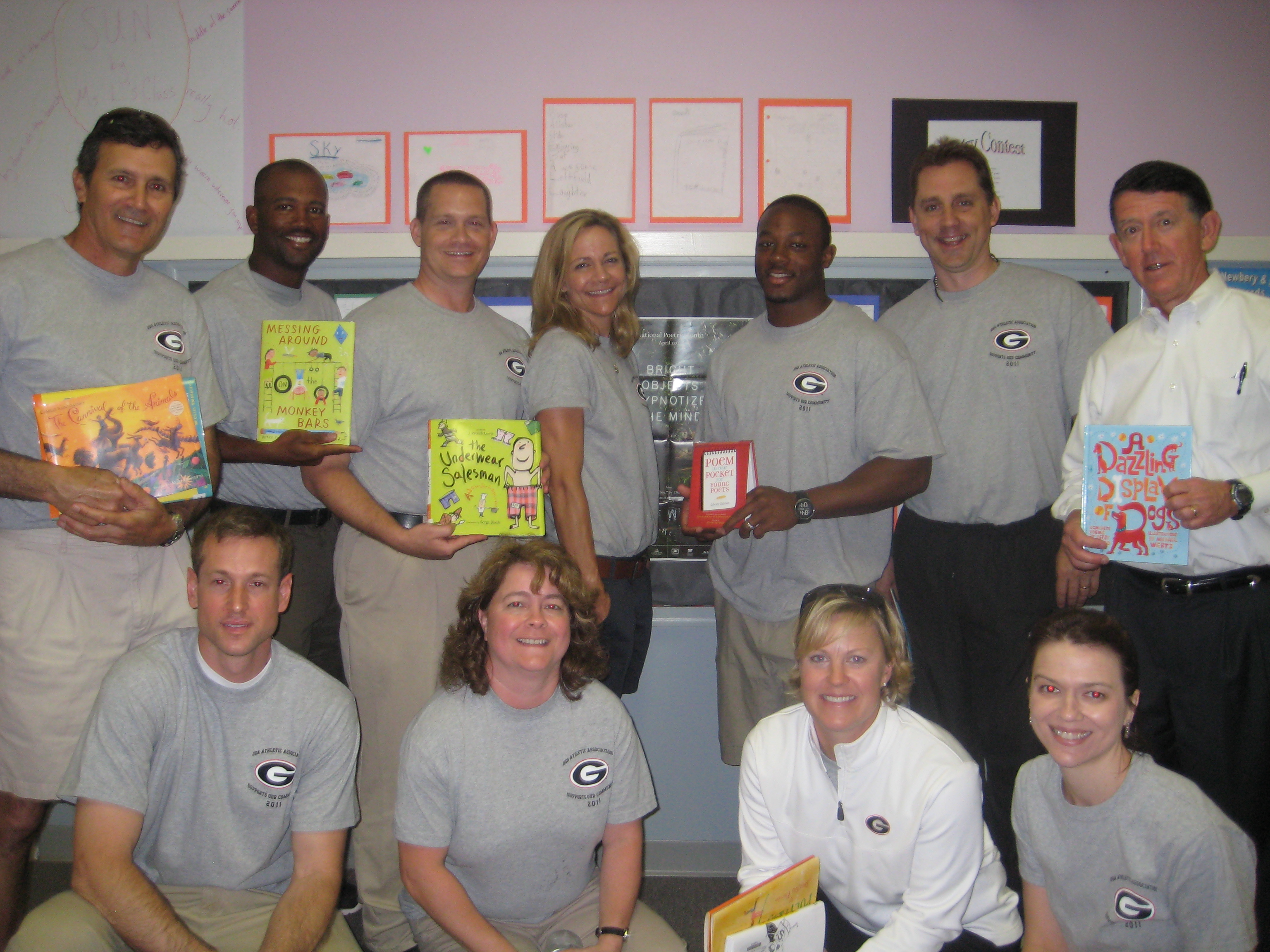 Today the University of Georgia Athletic Association had a day of service in Clarke County Schools and the community. We used these volunteers to support the many poetry lessons that are happening in the media center and in individual classrooms. Along with send twelve readers to go into classrooms, the athletic association also purchased 12 new poetry books to donate to our media center. Volunteers went to 5 classrooms: Ms Spurgeon’s PreK, Mrs. Hart’s 1st grade, and Mrs. Oprey, Mrs. Slongo and Mrs. Beshara’s 5th grade classrooms. They read poetry to students and worked alongside students as they wrote poems for our poetry contest and for Poem in Your Pocket Day.