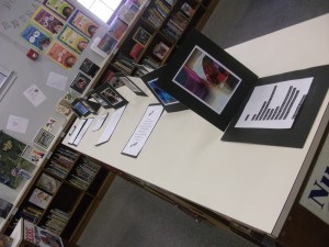 In my lessons, we’ve done some examples together and listened to past examples from classes. Students get in groups of 3 and wander around the media center browsing the shelves for interesting titles that seem to fit together. Once they make their decisions on 3-5 books, they pull the books off the shelf and arrange them in a stack.
