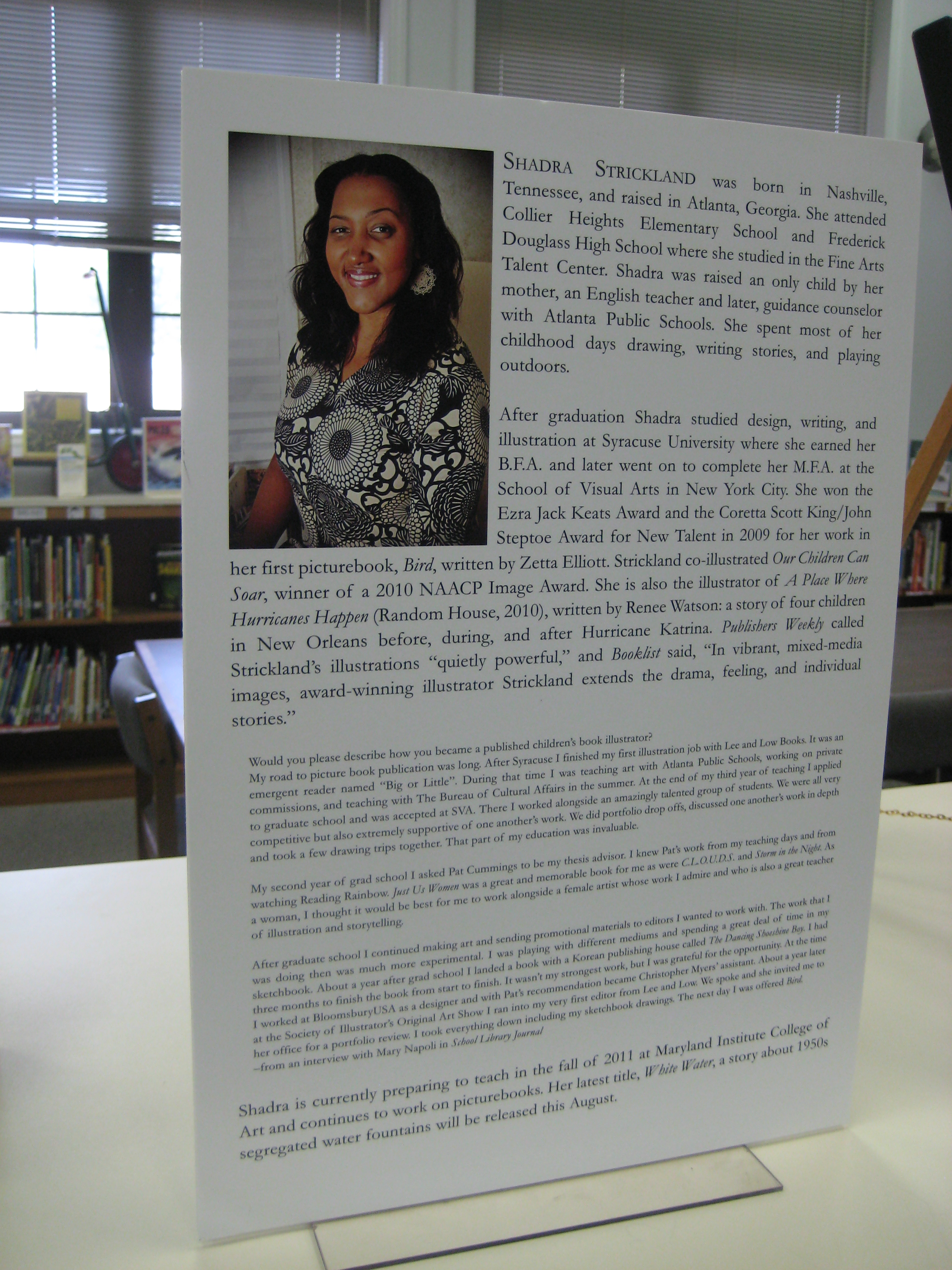 The Ashley Bryan Traveling Exhibit of Illustrated Africana Children’s Literature is now in our library! This exhibit is provided through a collaboration between the Auburn Avenue Research Library and the National Black Arts Festival. The display is on the tops of the shelves and features 8 works of art by Shadra Strickland, award-winning children’s illustrator. The exhibit will be with us until September 27th when Shadra Strickland will visit our school. To support the exhibit, we have copies of six books that accompany the exhibit, a curriculum guide to inspire lessons using the texts and artwork, and a school-wide subscription to Literacyhead.