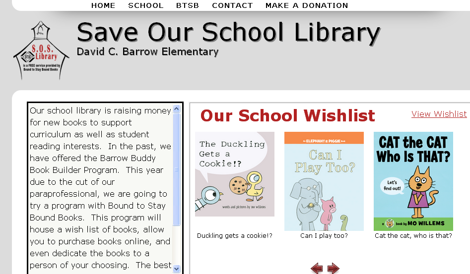 For the past 4 years, we have had a program at Barrow called the Barrow Buddy Book Builders. This program has allowed families and community members to purchase new books for our library from a wishlist and dedicate those books to someone special or in memory of someone. When orders were made, I had conversations with the students involved so that the book that was chosen matched an interest that they had. I also handled all of the financial records, wrote receipts, made the dedication labels and certificates, placed the order, processed the books when the came in, and more. Now that I no longer have a paraprofessional this program was one that I had to look at closely. Thankfully, Bound to Stay Bound Books, one of our main vendors, started a program called S.O.S Library. This program is essentially the same thing I was already doing, but BTSB does all of the work!