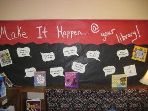 I am energized by the start of our orientations in the Barrow Media Center. Today, all of 5th grade and a 1st grade class came for orientation. This year we’ve embraced the theme “Make It Happen….@ Your Library!” This theme has many meanings for our program. The most obvious is that this year will be our first year without a media paraprofessional. I’m calling on all members of our library (teachers, students, families, community) to come together to make our space work this year with less paid help.