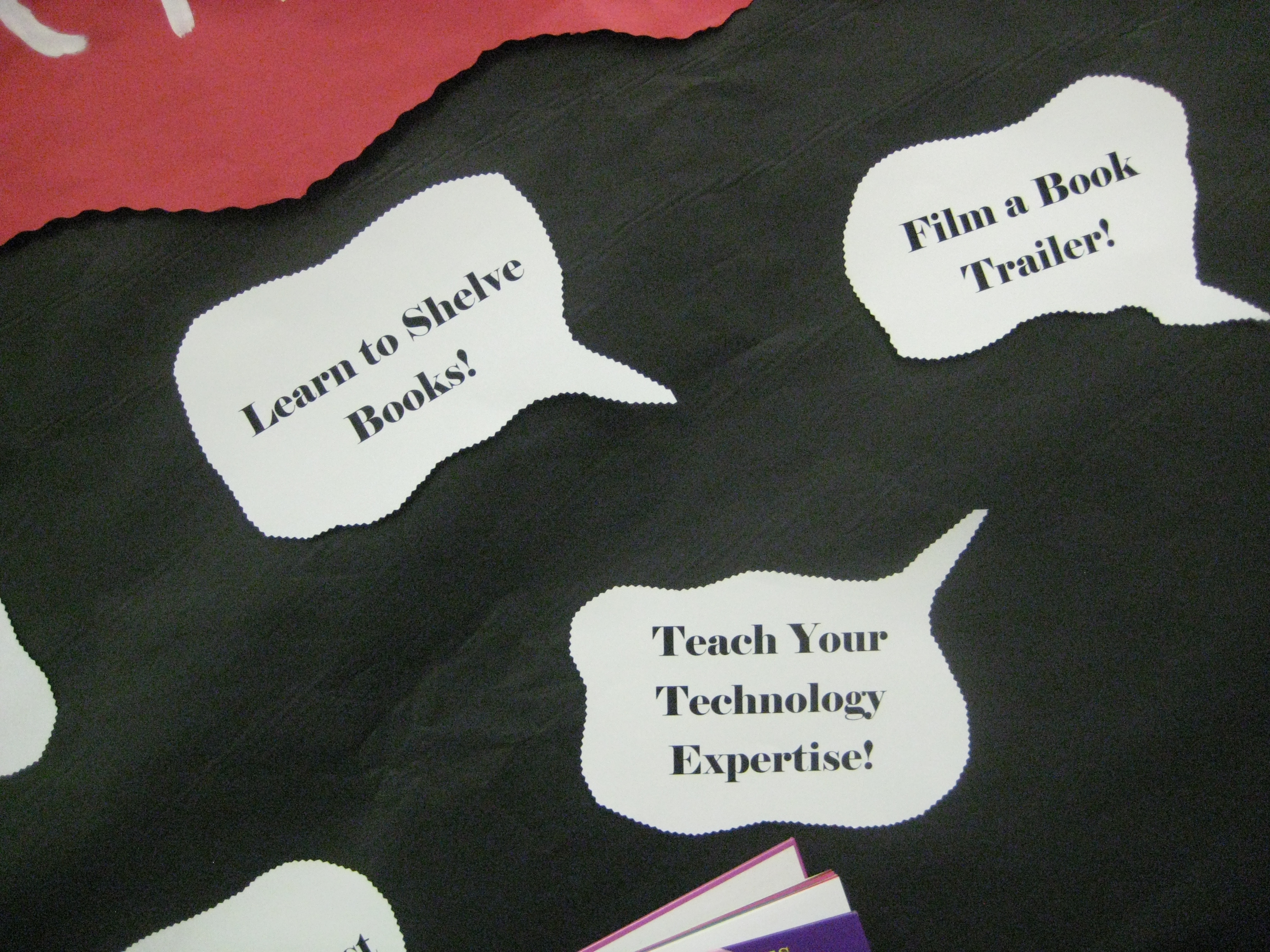 “Make It Happen” also means that our space is going to be a space for creating. This year, many collaborative lessons and projects will happen in our space and a main goal will be to facilitate students in creating their own projects. Even though students will be creating within these lessons, I also want them to have choices and opportunities for creating on their own. On the bulletin board, I’ve listed things such as design a bookmark, compose a library theme song, teach someone your technology expertise, film a book trailer, and more. In orientation, I’m openly inviting students to think about which of these ideas speaks to them and what other ideas they might have in their own minds and to make those happen somehow this year.