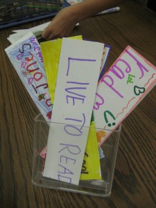 While the following idea is not one of the most significant examples of participatory culture or MakerSpaces, it is a small piece that serves to spark other happenings during the year. During orientation I suggested several examples of things that students might “make happen” during the year: create book trailers, shelve books, become a technology consultant, etc. One of those suggestions was to make bookmarks for other people to take. I suggested that if you want to see bookmarks in the library why not make that happen by making your own and putting them in the bookmark holder. Of course, with the busy start of the year, students forgot about it. This week students have been coming to the library for Scantron testing on the computers. When they finish, they just sit or read a book. Today, I pulled out markers, color pencils, crayons, and chopped-up card stock and told them they also had an option of making bookmarks. Almost every student chose to make a bookmark and their energy and excitement almost got out of control and disturbed testing! Imagine that! I documented their time through photographs and made an Animoto to play on our morning broadcast. Some of the students took blank bookmarks with them to make and bring back later. My hope is that their initial start will spark other students to want to participate. Not all students have to participate, but they need to feel that if they do contribute that their participation matters. I plan to do a quick talk on BTV after the video and see if this catches on spontaneously. I want our participatory culture to become more organic where students are coming up with ideas themselves, making suggestions, and taking action, but I don’t think that can happen all of a sudden. I’ll keep you posted!