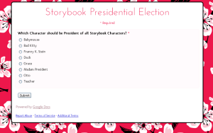 In the library, I read election-related books such as Grace for President, Duck for President, My Teacher for President, Babymouse for President, and Otto for President. After reading some of these (and looking at a few others), students used our 10 iPads and a Google form to vote for which storybook character should be president. Once voting was complete, we analyzed the results on the smart board and saw who was taking the lead throughout the day. The students and I used my phone to tweet the live election results via our media center twitter account and facebook page.![FireShot Screen Capture #020 - 'Edit form - [ Storybook Presidential Election ] - Google Docs' - docs_google_com_a_clarke_k12_ga_us_spreadsheet_gform_key=0Ap88RNajIVy5dFEwXzFXbHFjamN](https://expectmiraculous.com/wp-content/uploads/2012/10/fireshot-screen-capture-020-edit-form-storybook-presidential-election-google-docs-docs_google_com_a_clarke_k12_ga_us_spreadsheet_gform_key0ap88rnajivy5dfewxzfxbhfjamn.png?w=300&h=168)