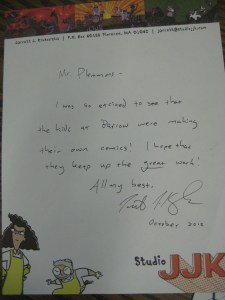 Remember this post about our virtual comic workshop with Jarrett Krosoczka? After the workshop, Jarrett read my blog post about how many students created comics as a result of the workshop. He and I chatted via twitter and email about the event and how inspiring it was to my students (and students around the world who watched).