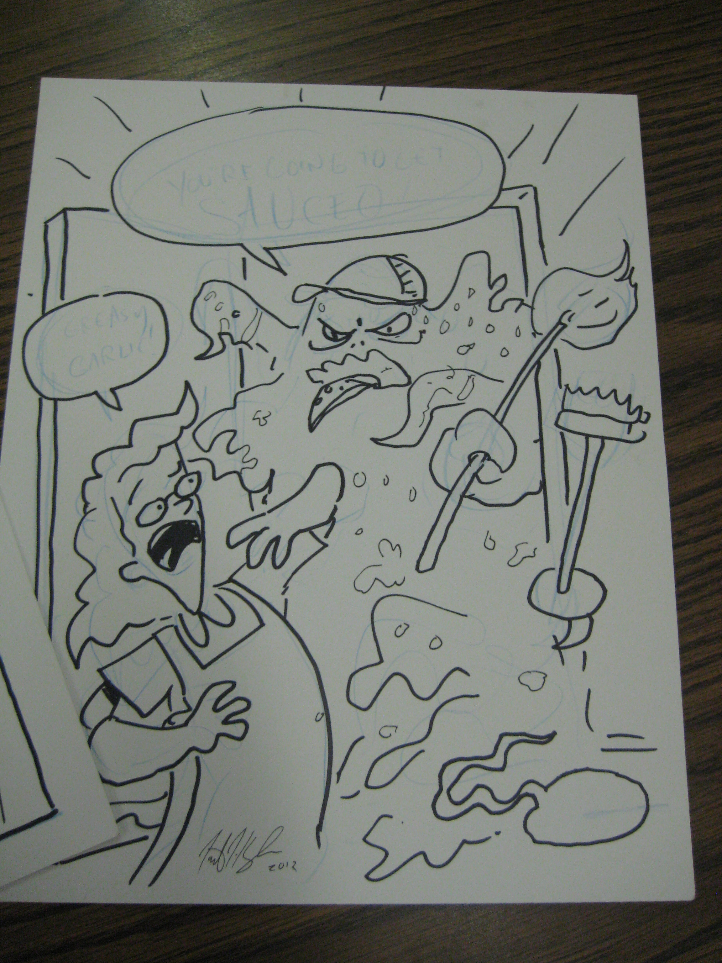 Another amazing thing happened as a result of my blog post and the work students did during the virtual workshop. Jarrett Krosoczka mailed us some of the original artwork that he created during the workshop, and he autographed it to our school!