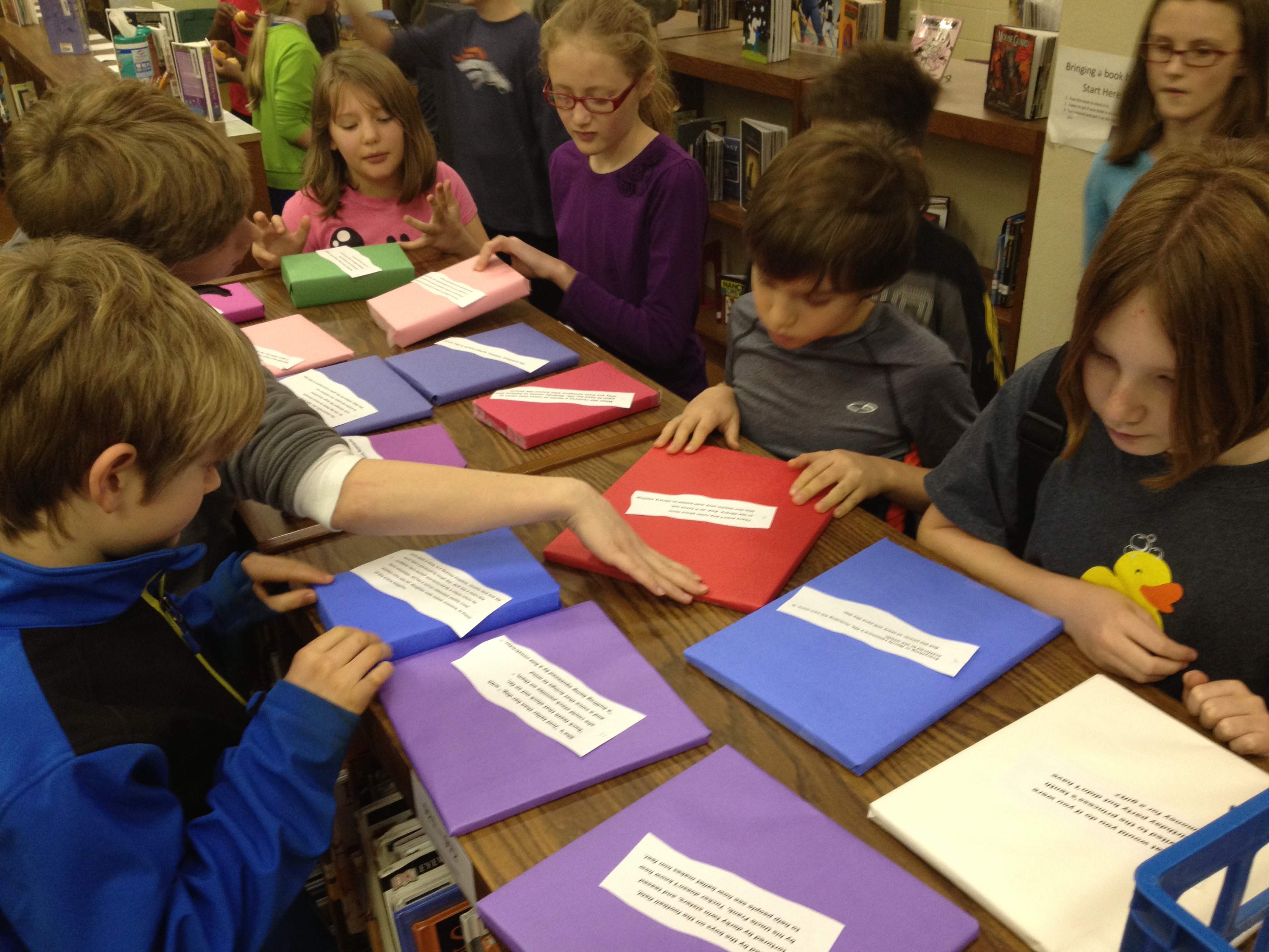 I took these ideas and passed them off to our wonderful library volunteers, Leslye Queen, Jen McDowell, and Hester Meyers who got the pieces in place. Leslye pulled books that were new or hadn’t circulated in awhile, wrapped the books in butcher and construction paper, wrote the barcode numbers on the back of the wrapping, and made a master list of the books that had been wrapped. Jen cutout hearts in preparation for a student creation area. Hester continued wrapping books and labeling the back. I found short blurbs for each of the books, printed them out, and glued them to the wrapping. I also made a small poster explaining the promotion.