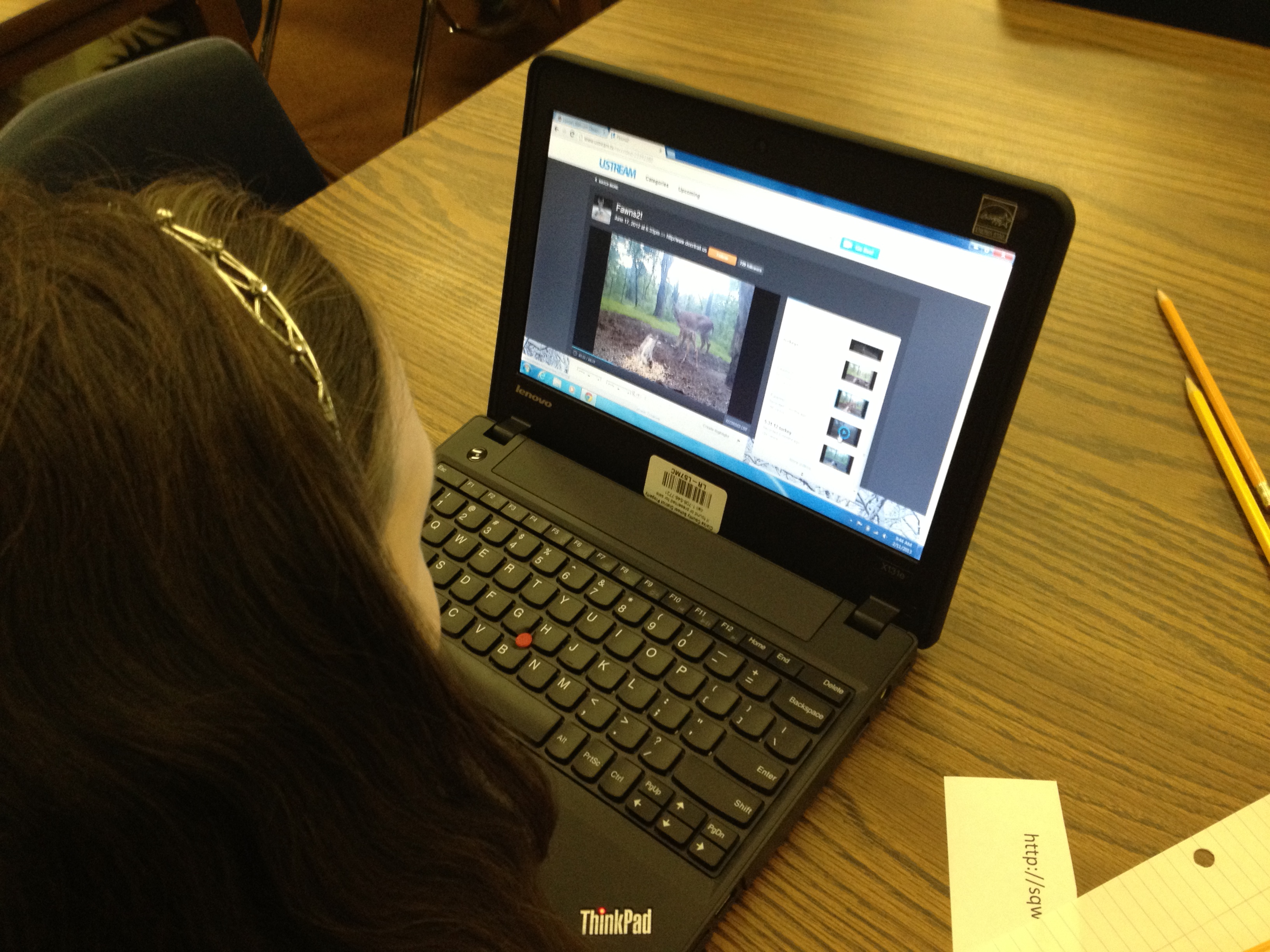 I wanted to help the students with observational skills.  When I stayed on Skidaway Island for 2 weeks a few years ago, I practiced careful observation in a field journal.  We decided to have one lesson in the library that explored careful observation.  I shared my journal including the sketches, quick notes, and deep reflection that I did on various pages.  I talked about the importance of being still, staying focused, noticing the small things, and observation stamina.  Then, students moved to computers where they used multiple live and recorded webcams to practice observing.  While students observed, the three of us made note of what they were doing well, what needed to be worked on, and what we might need to focus on as we did our actual observations of the birds at Barrow.  I think this practice session was really helpful to the process.