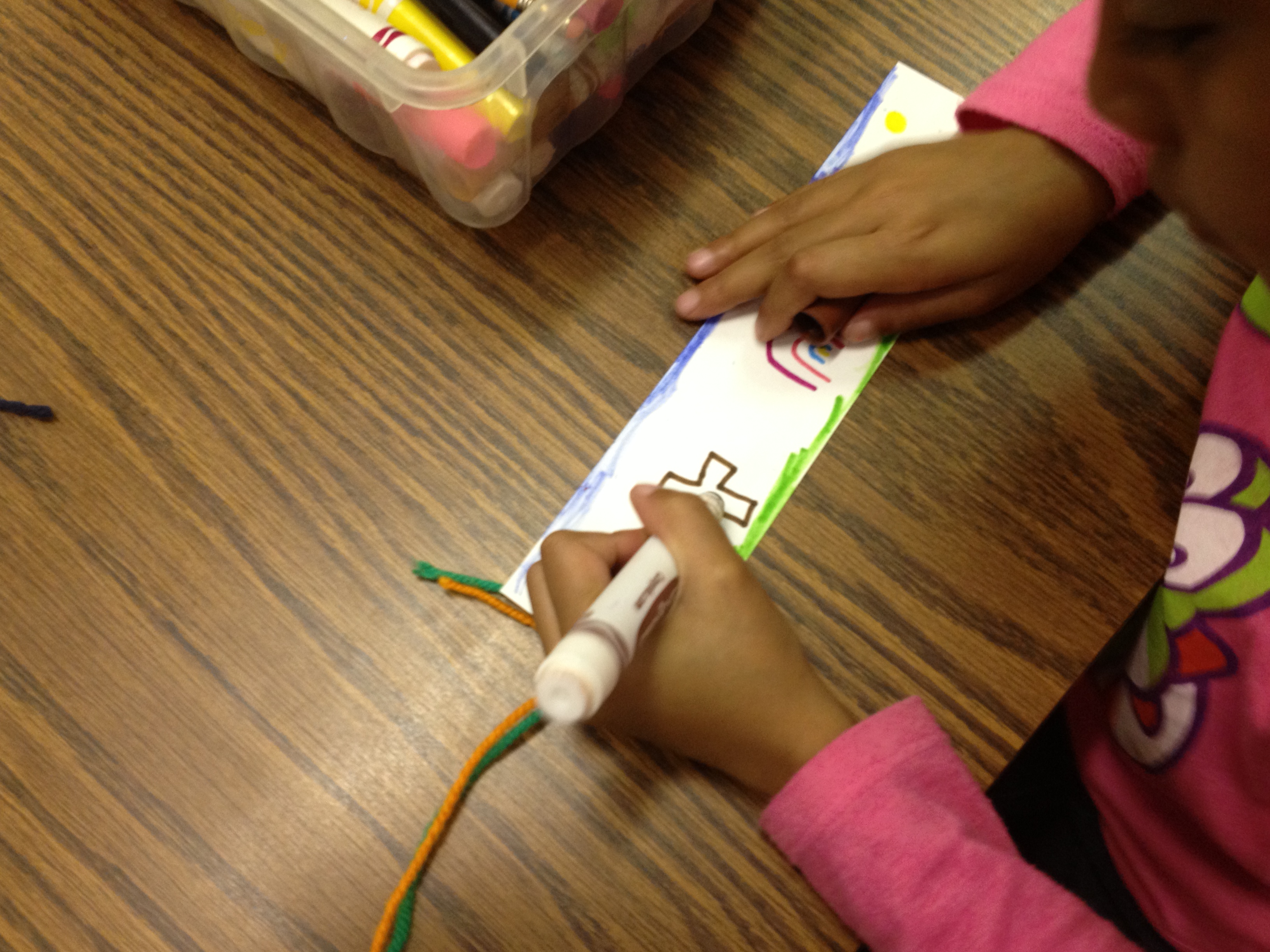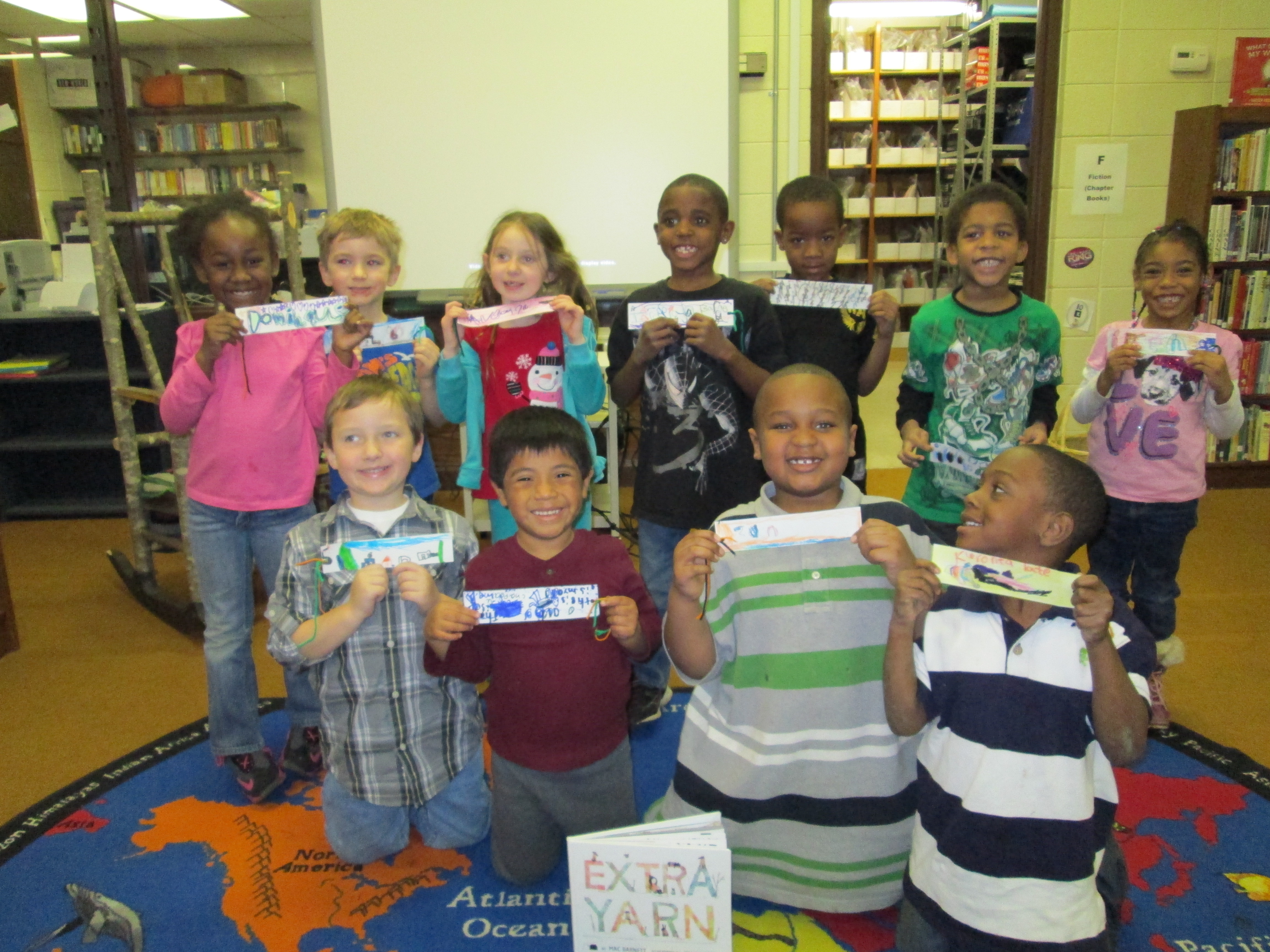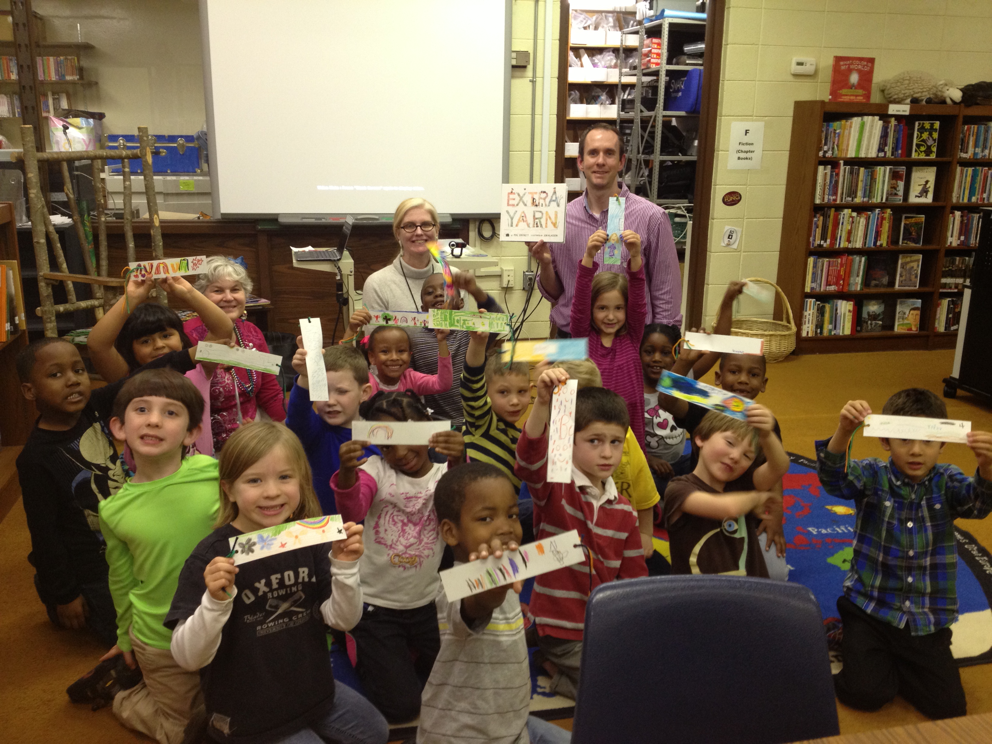 In today’s session, Ms. Hocking’s Class gathered in the library.  We talked about etiquette during the Skype session and looked at a map of where Van Meter Iowa is located.  We also did a quick intro of what we would be doing together.  Then, we made the call via Skype.  Shannon Miller introduced her students and we enjoyed waving at one another and saying hello.  Then, Shannon and I launched into reading the book.  We each read a 2-page spread of the book, and it was so much fun to hear 2 different voices reading the text.  The kids enjoyed joining in by saying “extra yarn” every time that appeared in the text.  It was great to hear voices in 2 different states shouting “extra yarn”.  We stopped a little bit along the way to look at how the illustrations were changing and to make some predictions.  Our last step was to make yarn bookmarks to send to one another.  Shannon’s students had already made their bookmarks before the call, so they were able to show us their work.  This really inspired my students to do their best work and to make connections to what Shannon’s students had already started.  We said goodbye and got to work on our bookmarks.  Each student had a card stock bookmark with yarn attached at the end.  They put their name on the bookmark and decorated both sides.  Now we will mail our bookmarks to Iowa and eagerly await bookmarks to arrive from Iowa.  We plan to continue to connect these 2 classes through a follow-up project in book making.