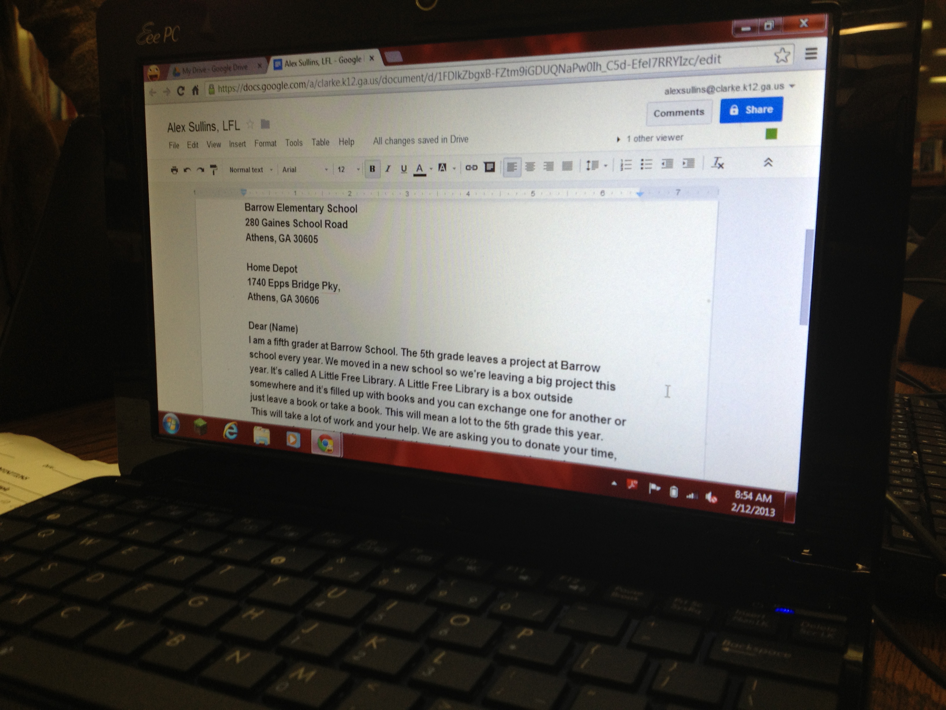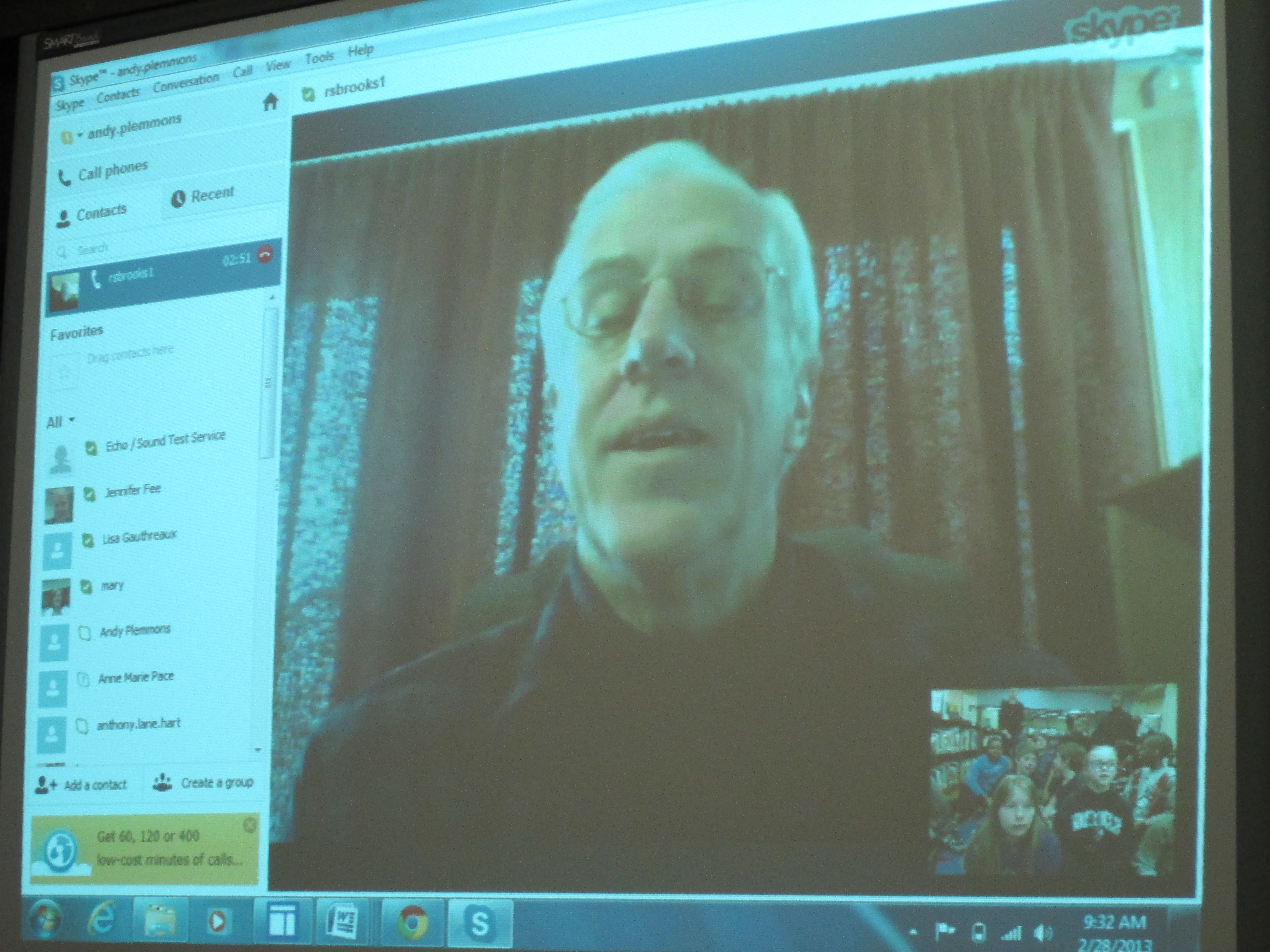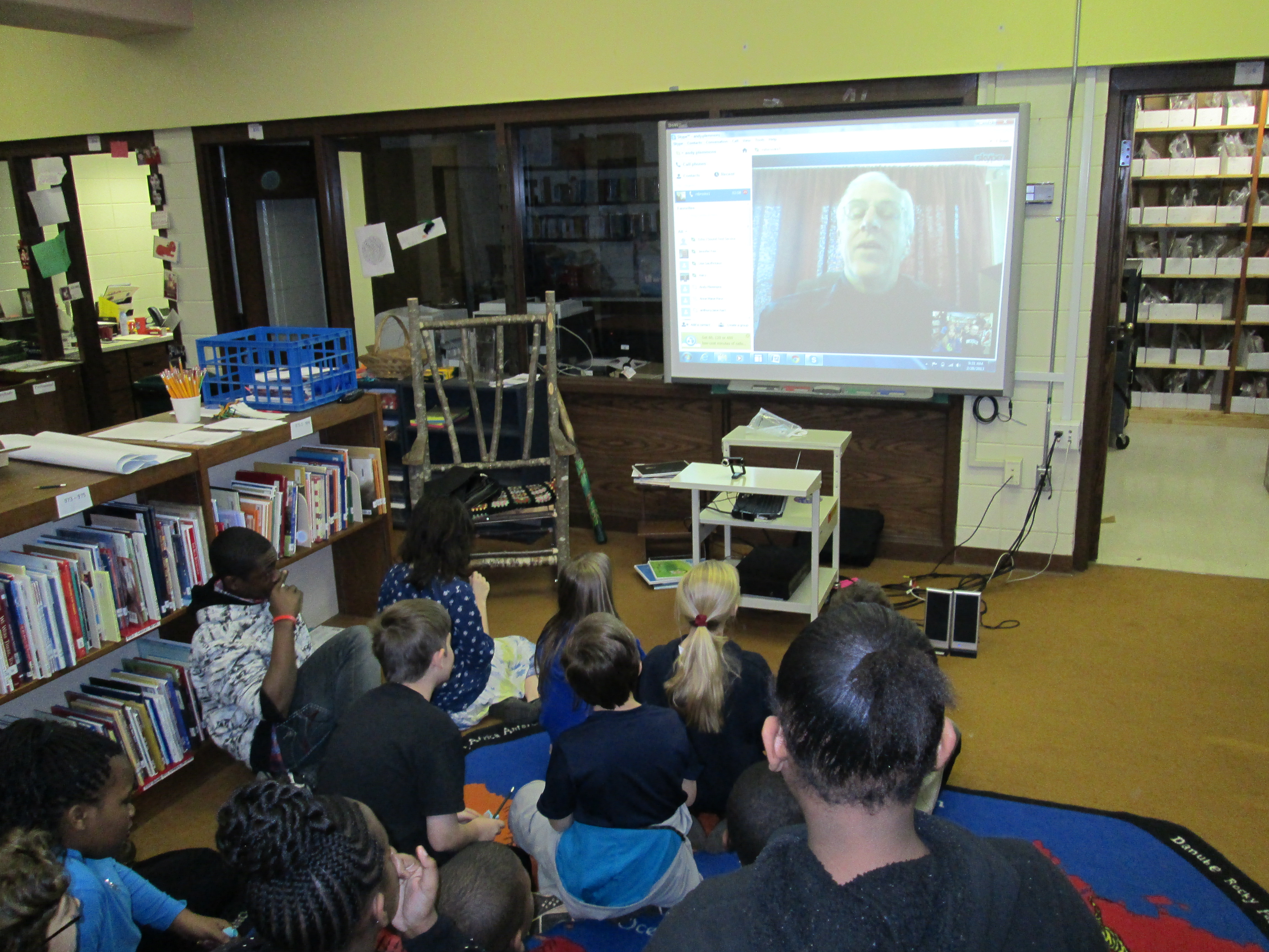 IMG_0082Our 5th grade Little Free Library Project is moving ahead.  You can read about our progress here and here.  A few weeks ago, I talked with Rick Brooks, co-founder of the Little Free Library movement, on the phone.  He contacted me after seeing my Youtube video introducing the project to our 5th graders.  After a few emails and facebook posts back and forth, we finally had a long phone conversation where we discussed other Little Free Library projects in schools as well as some potential ways that technology could be incorporated into our Barrow project.  I shared with him how our students were working in teams where each student had a specific job to do such as researching, writing, designing, and presenting.  During our call, he offered to help us in any way he was able to, so I suggested a Skype session with our students.  He was happy to do this.IMG_0080