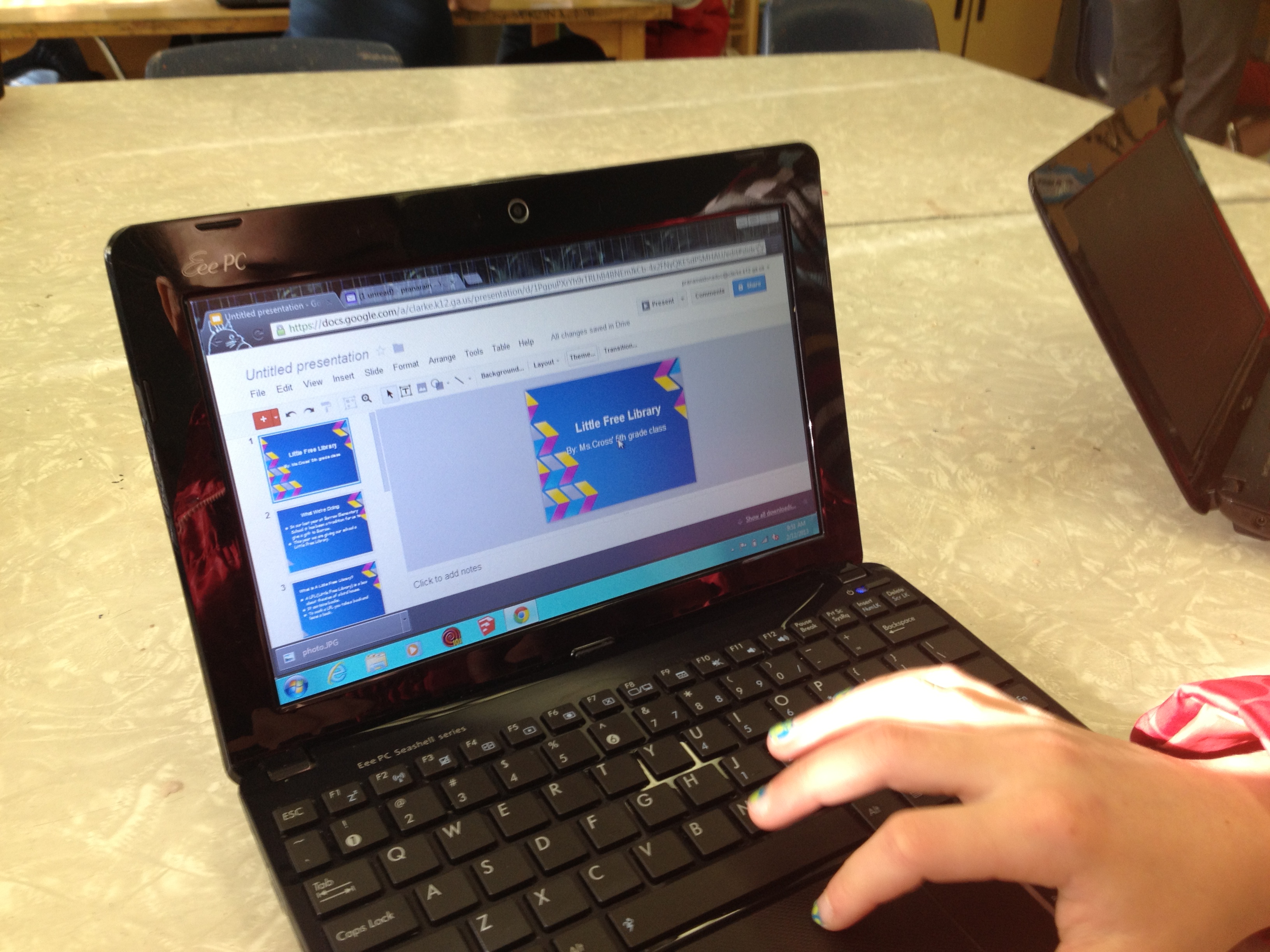 The student teacher is a Google Sketchup expert, so she has the lead designers using this tool to design a potential Little Free Library.  Students have made sketches on paper and moved to Google Sketchup to create a model of their library.  Presenters are putting together a presentation to inform our audience about each library design.  We may end up having the principal choose 2 designs or we may move forward with a student vote. LFL 4