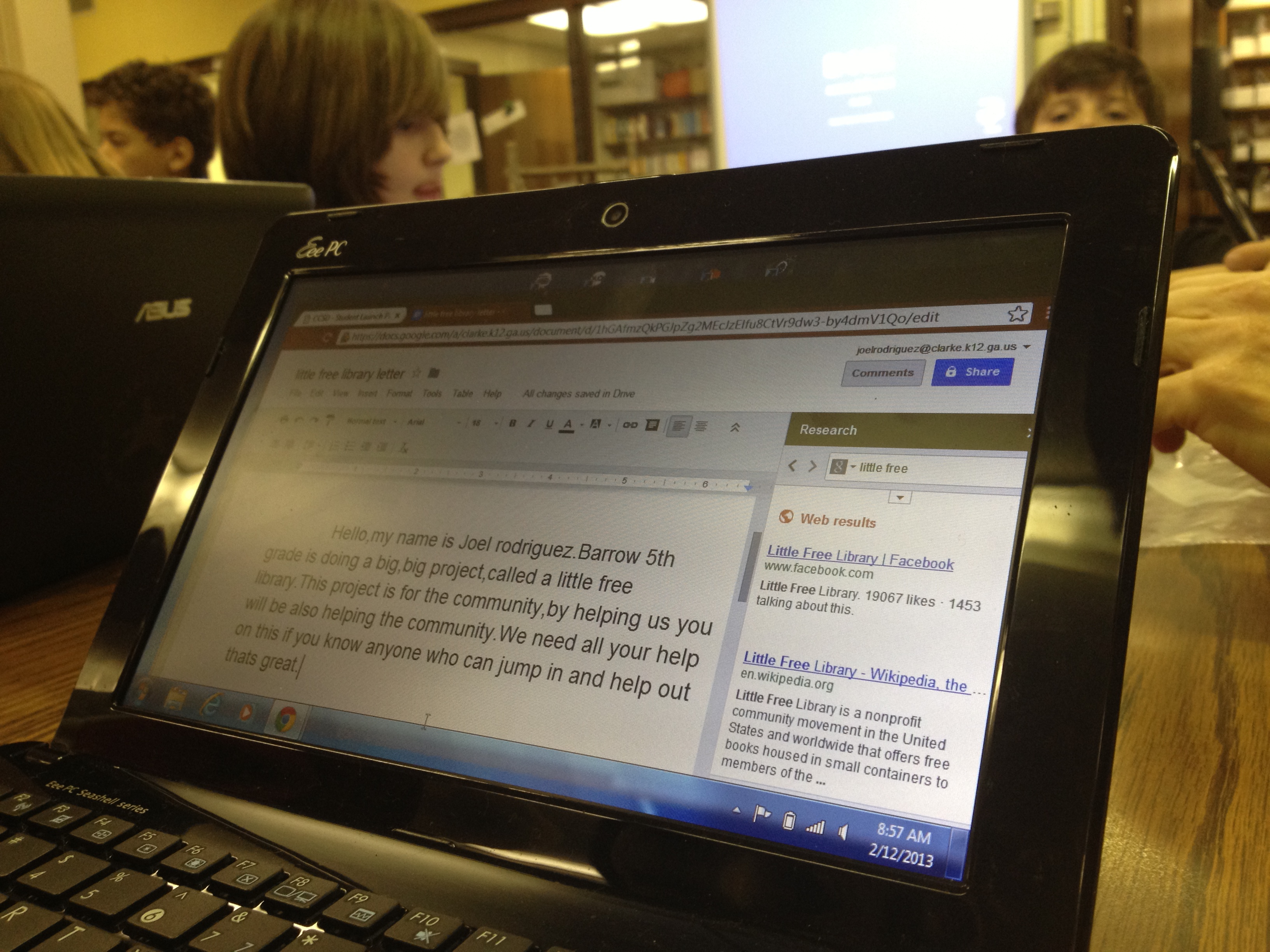 I’m also working with the 5th grade classes on persuasive writing techniques.  We used the Read Write Think powerpoint of strategies and thought about what information we might include underneath each strategy.  I also showed them the research tool within Google Docs.  The students (and teachers) were excited that you could search for a topic such as “reading statistics” to find quotes about reading in the United States and automatically cite the source within your Google Doc.  I think this tool alone will spill over into many other projects now that the students know how to use it!  All 5th graders are writing letters to businesses, builders, parents, students, and other groups in order to ask for money, labor, supplies, books, and a location for our 2nd library.  The teachers are continuing this writing in the regular classroom as well as exploring the Little Free Library site for additional information.  One student was even able to locate a Little Free Library from his hometown in India!