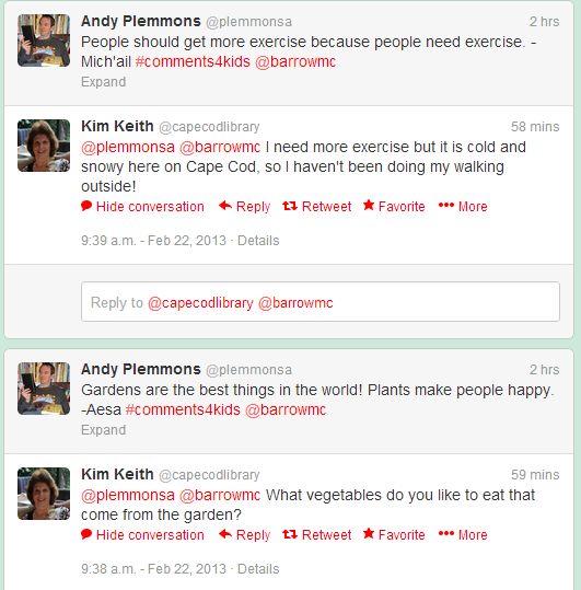 Within just a few minutes, we started getting some responses some fantastic friends around the country.  Kim Keith @capecodlibrary and Sue Kowalski @spkowalski were the first to respond with some comments, questions, and even pictures to respond to the students’ tweets.  They were so excited to see that their thoughts were being read by people around the world.twitter convo 1