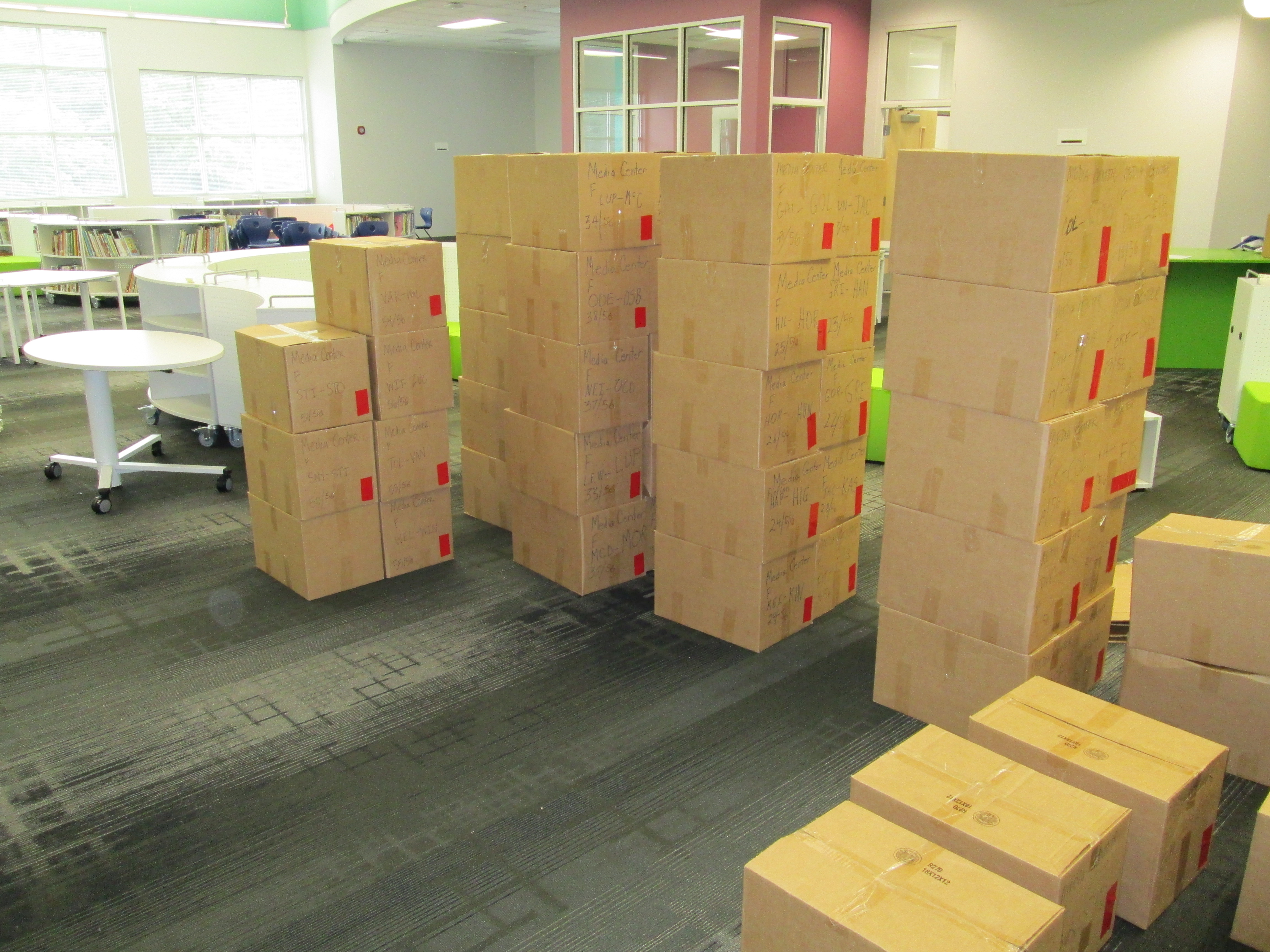Today was our second day of unpacking boxes into our new school library. After being away at a meeting yesterday, I spent some time walking the space and thinking back through Monday’s decisions. For the most part, I was still happy with what was decided. I flipped one shelf around in the fiction section and it really opened up the flow into the library better. Some new rolling tables had arrived, so I worked on putting those into the 2nd projection area where I think students will most likely use devices while paired with demonstration on the projection screen. I decided that the Lego robotics table will move from its current position near the front of the library into the back corner. The wall I chose has no outlets. This allows the wall with outlets to be used for computer tables.