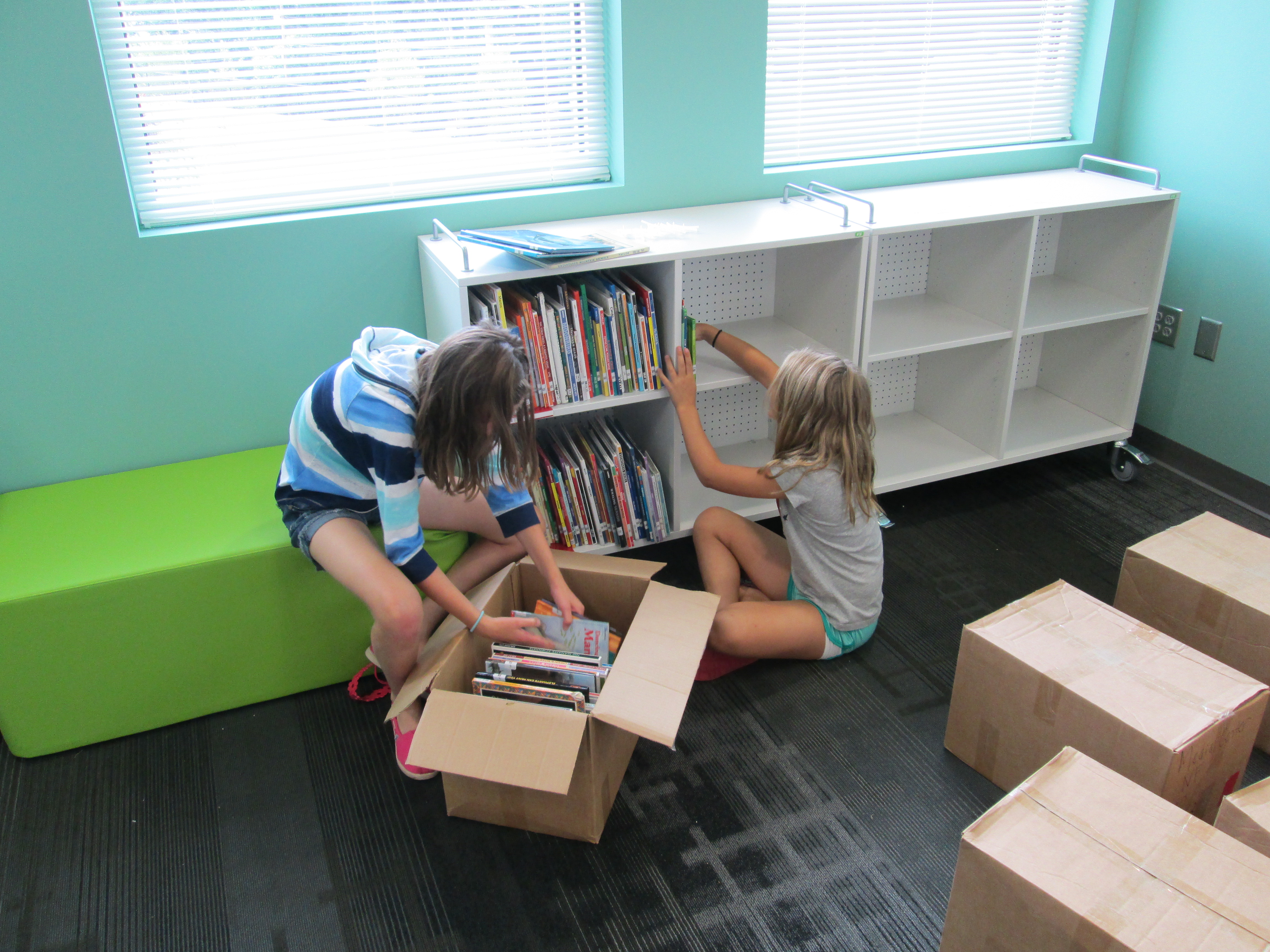 It didn’t take long until our first problem of the day. The fiction books didn’t fit on the shelves. That statement has multiple meanings. Some books were too tall for the shelf so they had to be turned sideways. Other books were pulled to put in other sections of the library like graphic novel and everybody. The worst part though was that all of the shelves were full and there were still 4 boxes to unpack. First I tried to think of how to get another shelf, but then I started thinking about what could be pulled from the fiction and put somewhere else in the library. We are still missing 3 big display cases that will have multiple functions. One function is holding books, but without the cases in place it’s hard to decide what to put on them. I decided to go around and pull some of the most popular series of books from the fiction shelf so that they could go on this display. The next step would be to shuffle all of the books down the shelves to fill empty spaces. I know that the books will fit if I do this, but i decided to delay this part of setup until I know more about the cases that are coming.