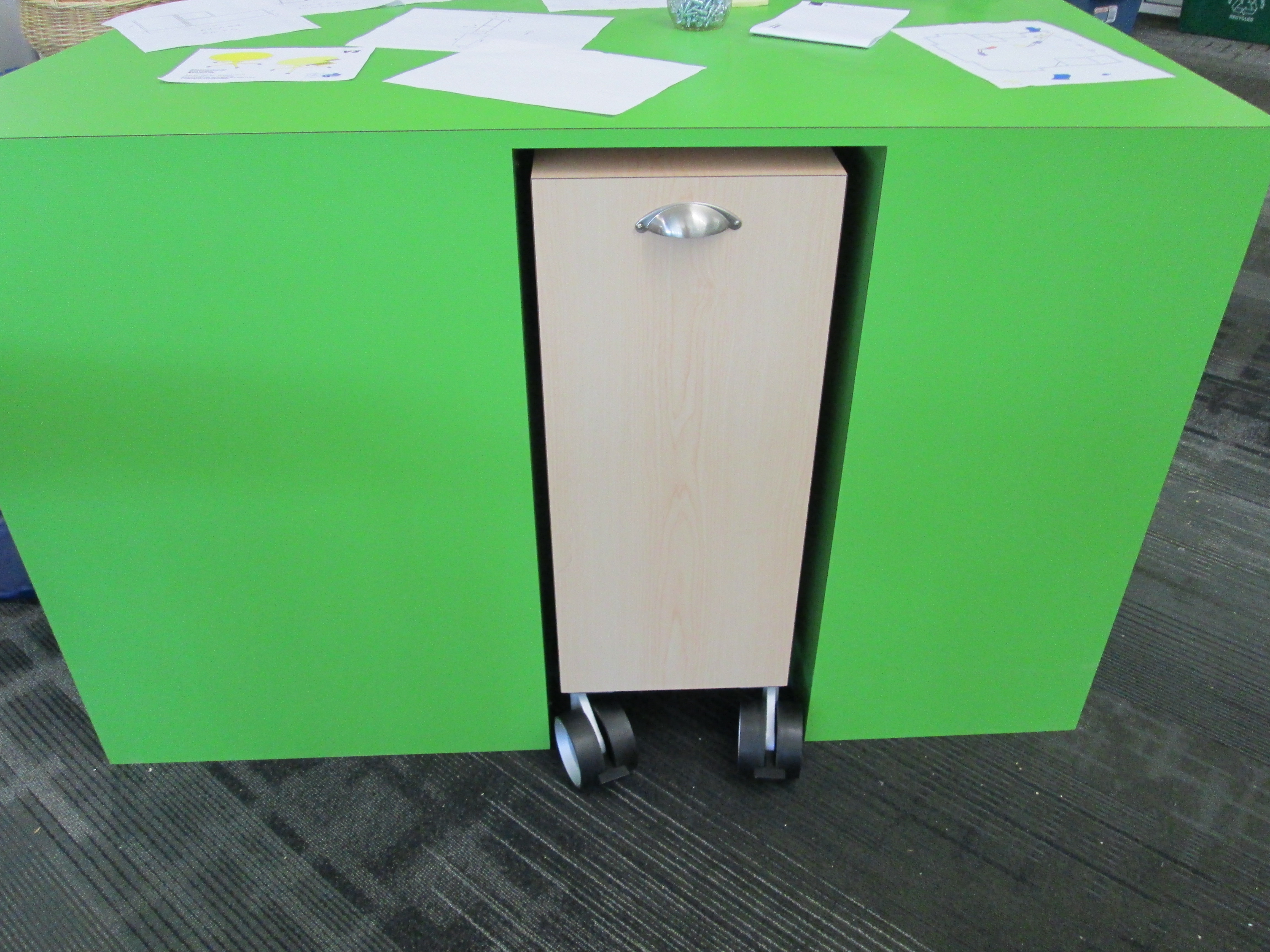 Published August 5, 2013 at 4608 × 3456 in Setting Up a New Elementary School Library (Part 3) new library (48) An extra reshelving cart parks inside the circulation island ← Previous Next →
