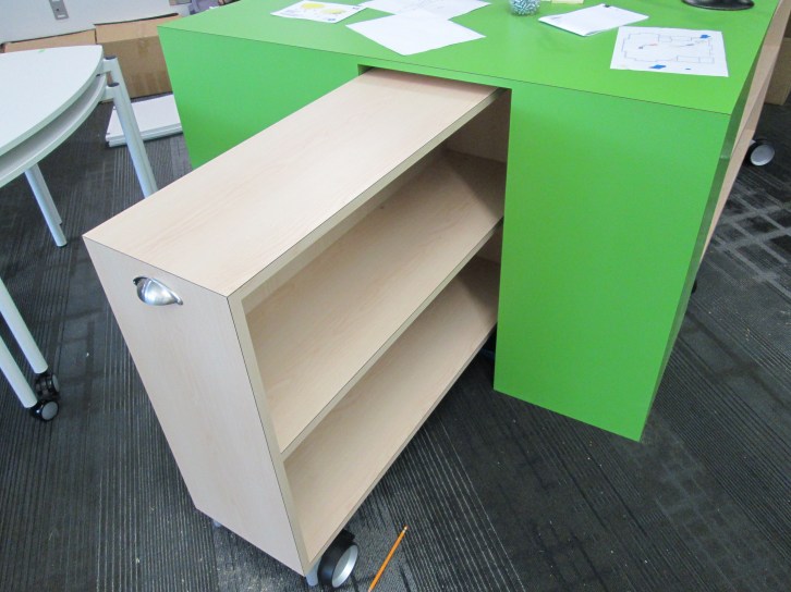 Published August 5, 2013 at 4608 × 3456 in Setting Up a New Elementary School Library (Part 3) new library (49) An extra reshelving cart parks inside the circulation island ← Previous Next →