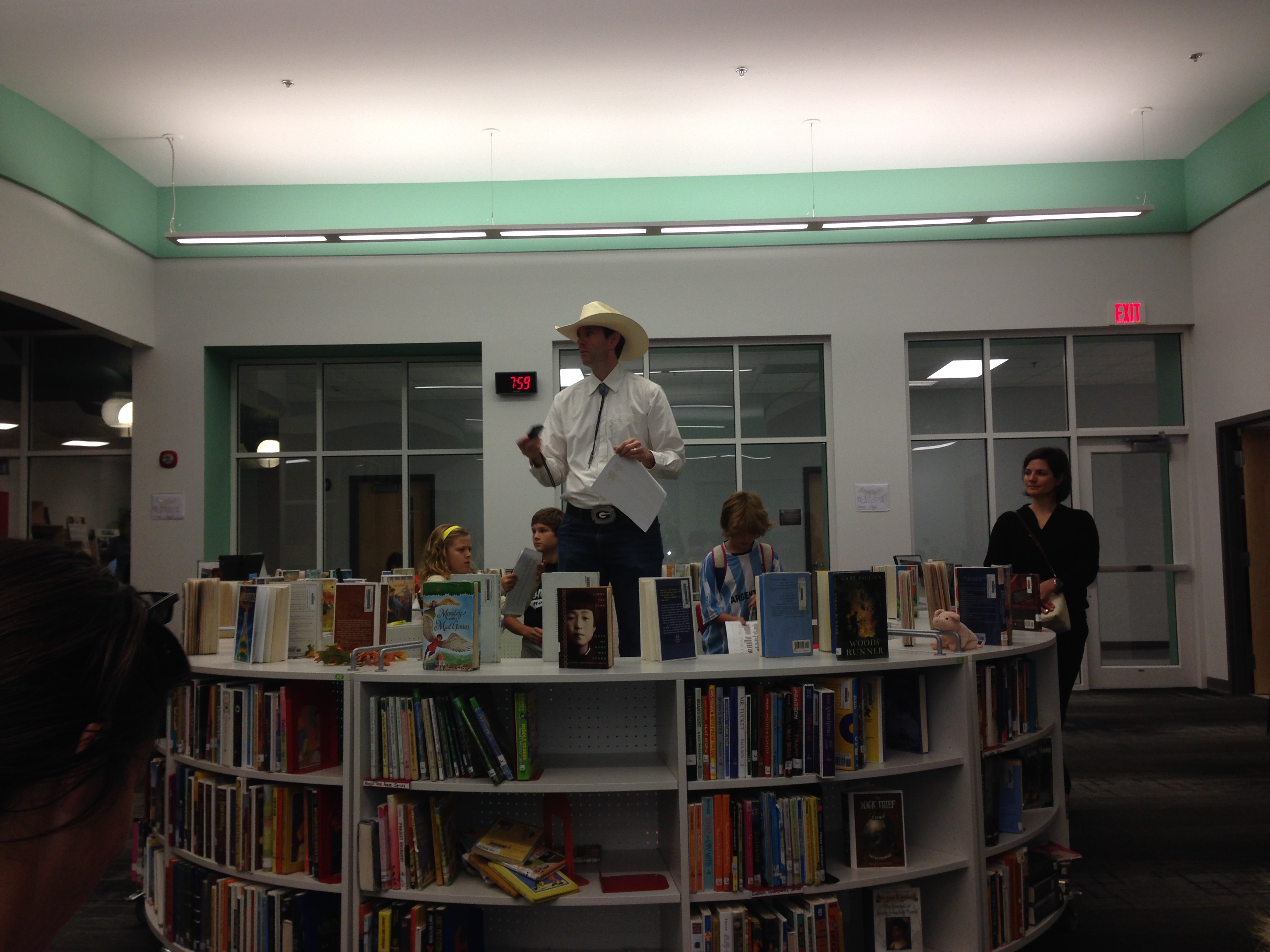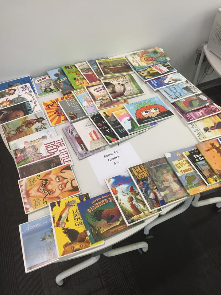 On the morning of storybook celebration, guest readers arrive in the library between 7:30-7:50. They sign in at the counter and select a book from 2 tables that are organized by books for PreK-2 and 3-5. All of these books are pulled by me ahead of time. Some readers bring their own book.