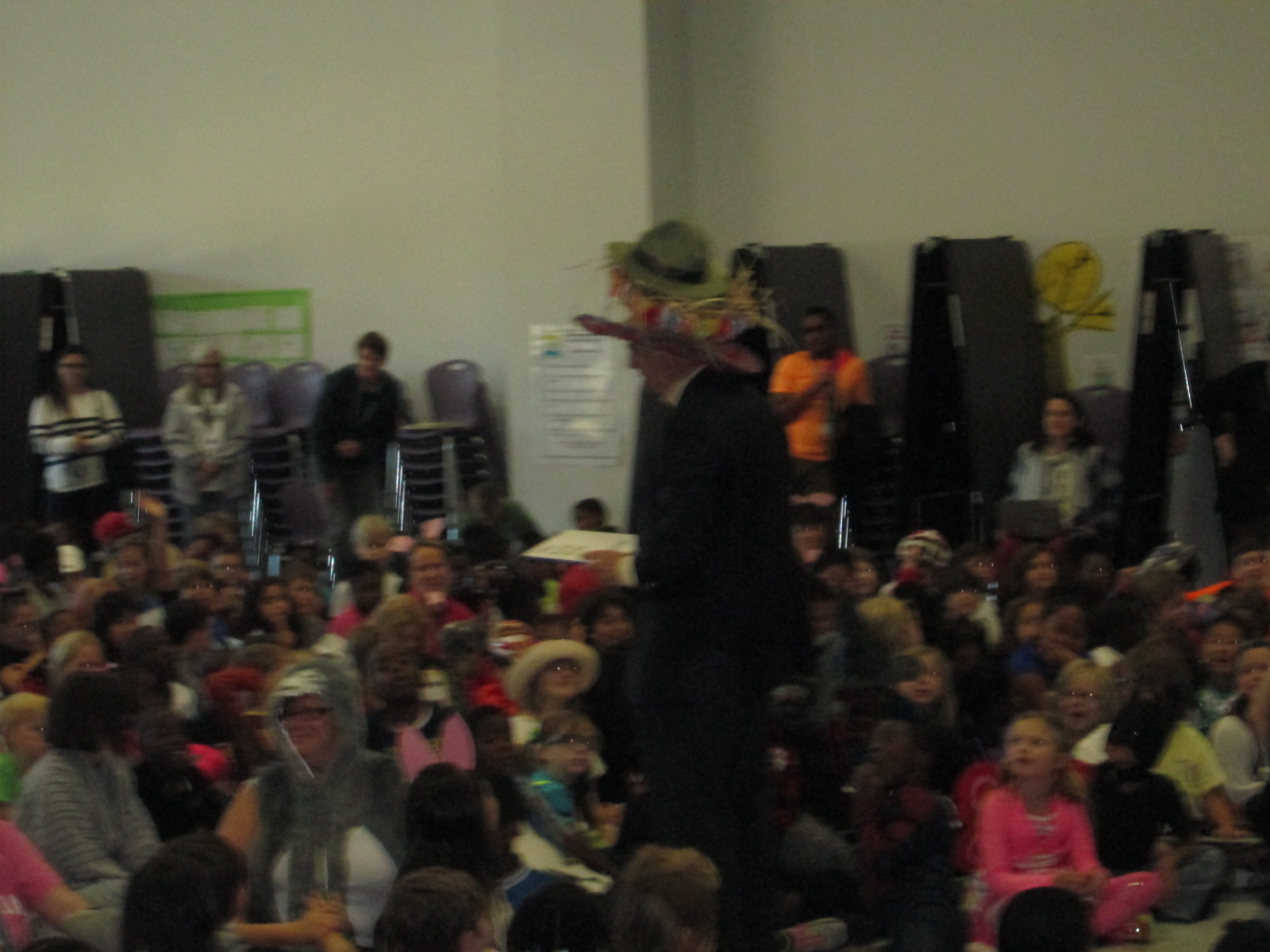 At 9:00, we gather in the cafeteria for the assembly. This year, we tried some new things in the assembly, which required some organization in advance. We had an assembly guest reader. Our family engagement specialist helped a lot with the assembly. She contacted and organized Dan Coenen, a UGA professor and community member. He read The Book with No Pictures and had the kids laughing and engaged.