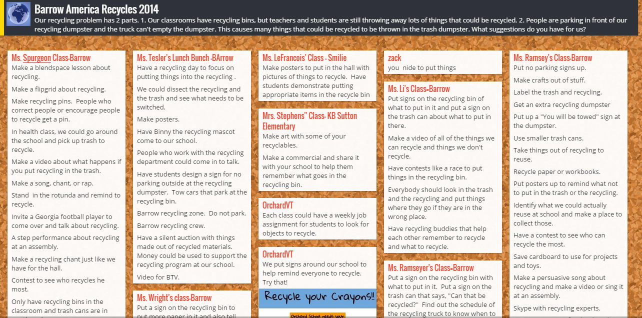 Our next step is to take this Padlet and share the ideas with our environmental committee which is chaired by Natalie Hicks.  We also have 2 enrichment clusters that we can share the Padlet with.  Our hope is that some of the ideas that came from so many perspectives will spark change within our school problem.  We want to connect back with some of the classes we met this week and share what we’ve done to improve our problem, and we want to see what they have done since our connection.