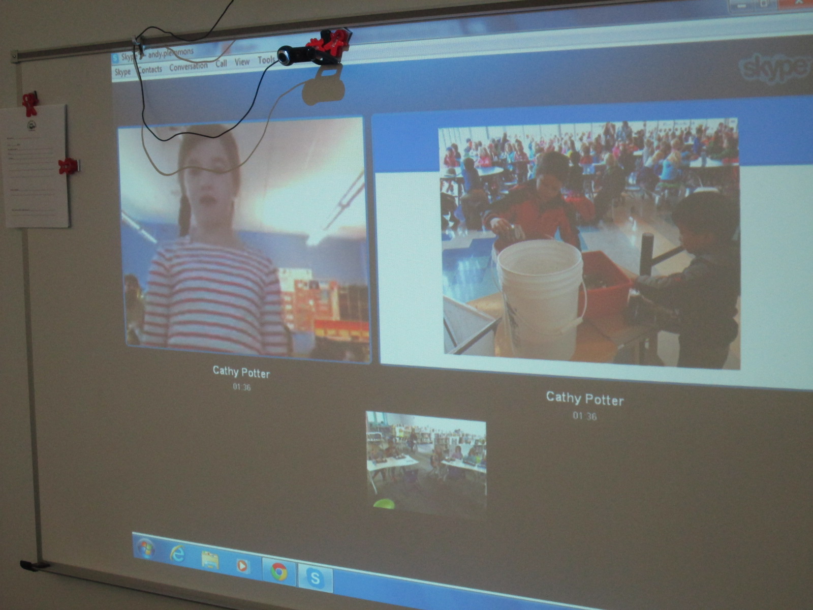 Ms. Tesler’s 4th grade students gathered a lunch bunch together to connect with Cathy Potter and her students in Falmouth, Maine.  The 1st graders at her school showed us a Google presentation with pictures of recycling and composting efforts in their school.  They have a whole process of how their scraps at lunch get put into a bucket to go to the composting bin.