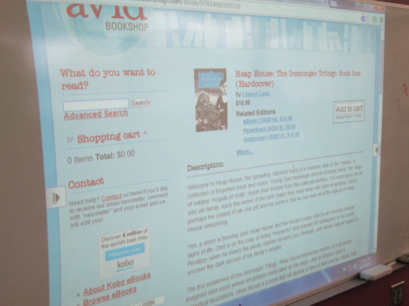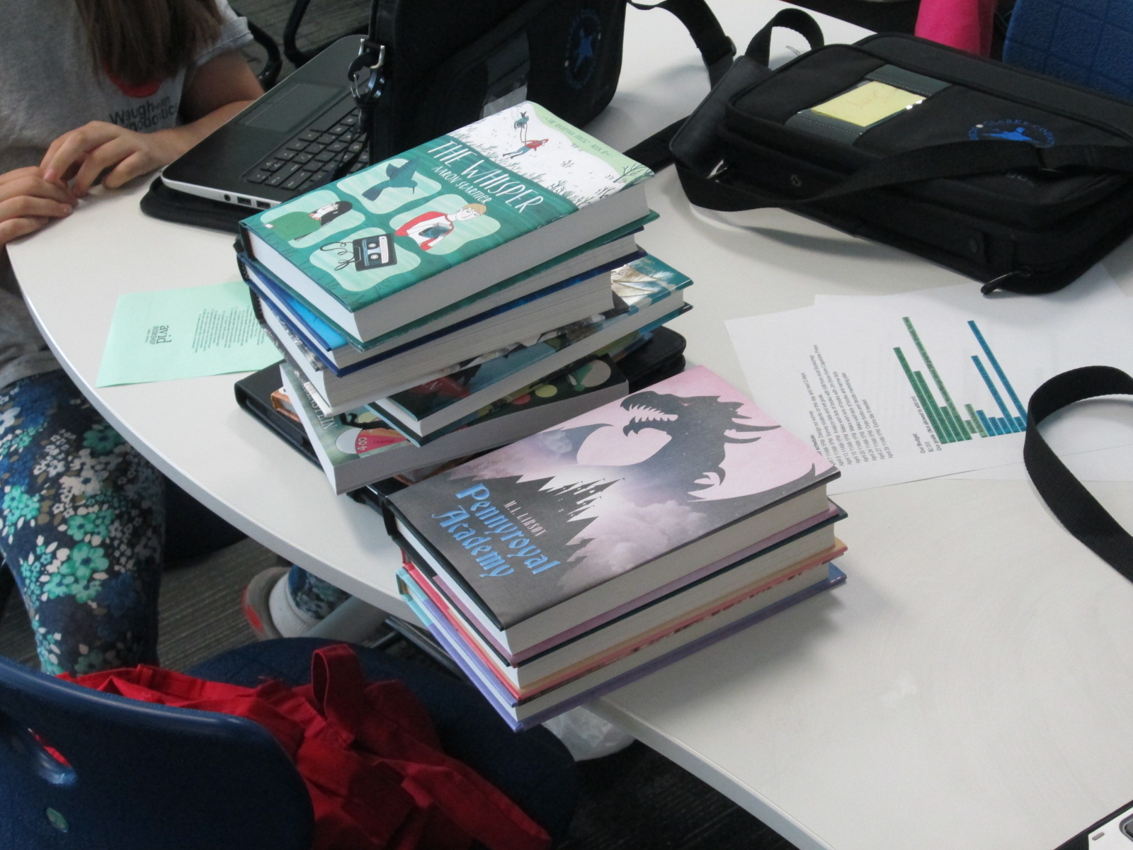 During our final meeting before ordering, we were able to Skype with Karyn Lewis in Houston, Texas. She was inspired by our long-standing project to try this with her students. She also worked with her Capstone representative. It was fun to have our group who was about to place an order talk with her group who is still in the midst of making decisions. The students were able to take turns telling about our work so far. We immediately noticed the connections that our students had with the students in Texas. Some of the same types of books were popular in both states, and graphic novels were high on the list.