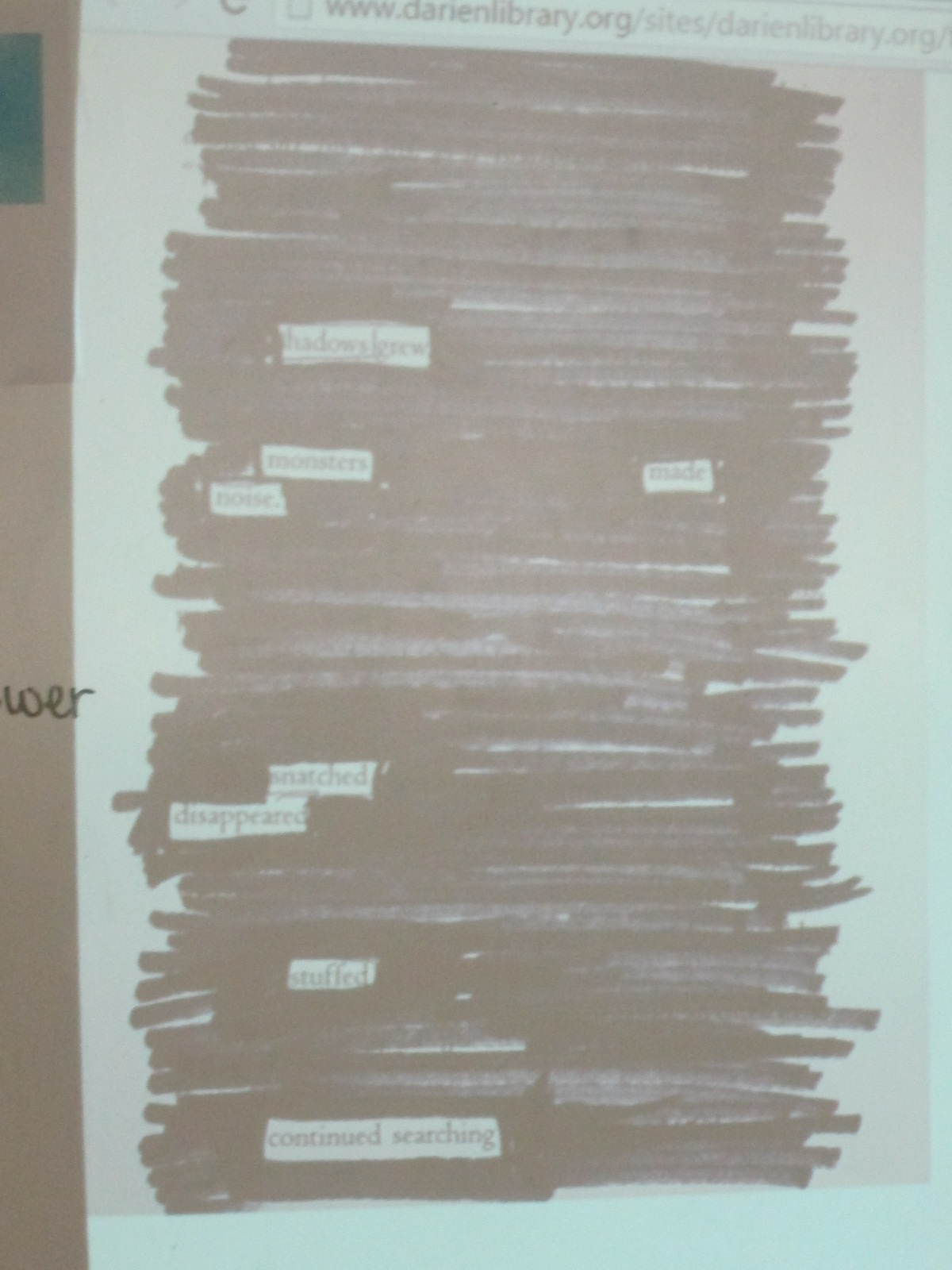 Published April 8, 2015 at 1200 × 1600 in Kicking Off Poetry Lessons for Poetry Month: Blackout Poetry blackout poetry (8) ← Previous Next →