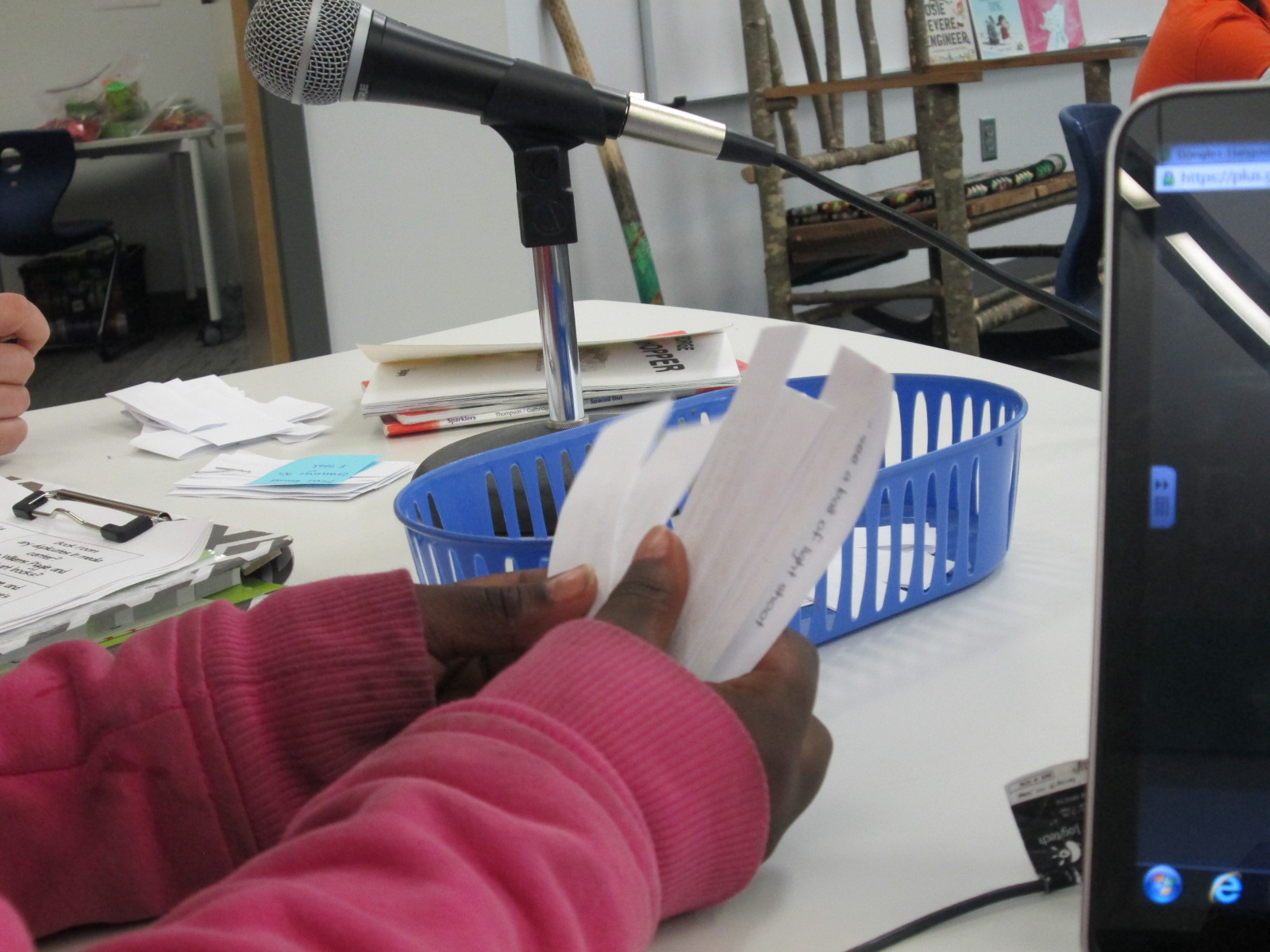 At our annual Poem In Your Pocket day, the groups of students performed their poetry songs for a live audience.  We even had poet, Laura Purdie Salas, listen in to the poetry since students were inspired by her space poems and songs.