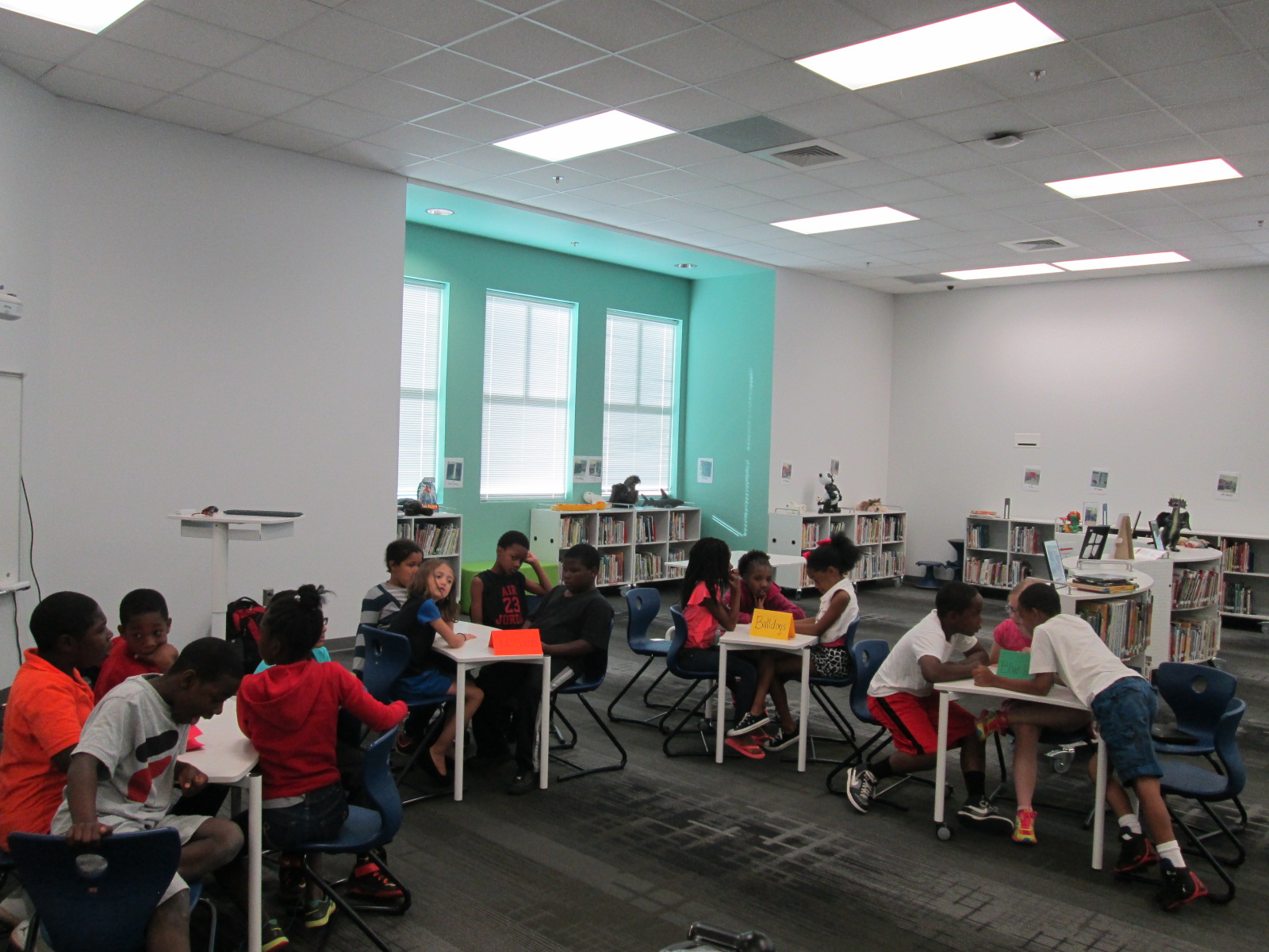 Before student arrived, I setup the 5 centers around the library so that they were somewhat in a circular arrangement.  I wrote the 5 centers on the whiteboard so that students could check the order as needed.