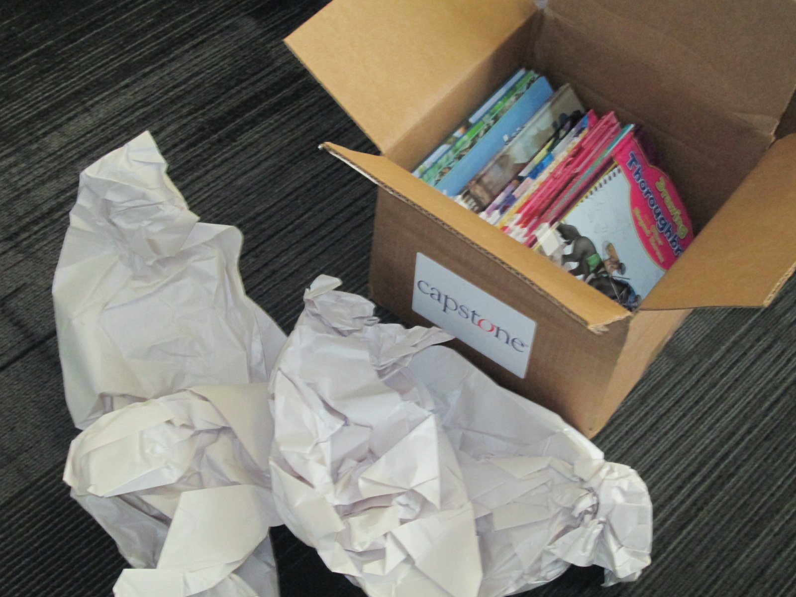 All of our books from Avid Bookshop arrived during our author visit with Sarah Weeks.  The first box of Capstone books arrived while our 5th graders were at Skidaway Island.  I emailed the whole book budget group and told them to come today at noon to unpack books.