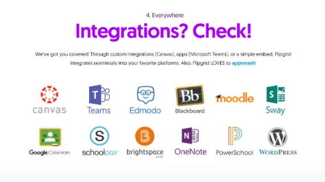 In education we use many platforms. Flipgrid now integrates with multiple platforms including Google Classroom, Canva, Edmodo, Blackboard, Moodle, Sway, WordPress, Powerschool, Schoology, Brightspace, OneNote, and Teams.