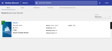 I simply went into each subcategory in Destiny and changed it so that it specifically said “chapter”, “picture”, or “information” next to each genre category. Now, when a student searches, they will see a book like Ghost by Jason Reynolds is in the “Sports Chapter” section.