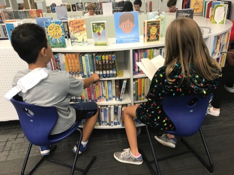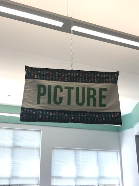 Now, each sign is flying high in our library to help kids see where our 3 main areas of the library are. Since they hang by a single chain, they freely rotate with the gentle air currents. It’s a simple change that I really should have done much sooner, but the library is always evolving, and sometimes a small change is just the thing that was needed to make the collection easier to navigate for readers. I’m so thankful for the many talents that exist in our community, and this project once again reminded me that so many people are out there waiting to support the work happening in schools, but many times we have to put our work and requests out there to help them connect to those opportunities. A huge “Thank You” goes out to Amy Norris for taking the time to create these beautiful signs that we will enjoy for years to come.