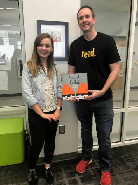 While the video played, we talked about the day’s challenge. Students were challenged to design a catapult that could launch a candy pumpkin across the library. They used the video to name some of the materials they would need: plastic spoon, popsicle sticks, rubber bands, tape, and a pumpkin. Students also saw in the video that there were many designs of catapults and that adjustments were constantly being made to improve the catapults.
