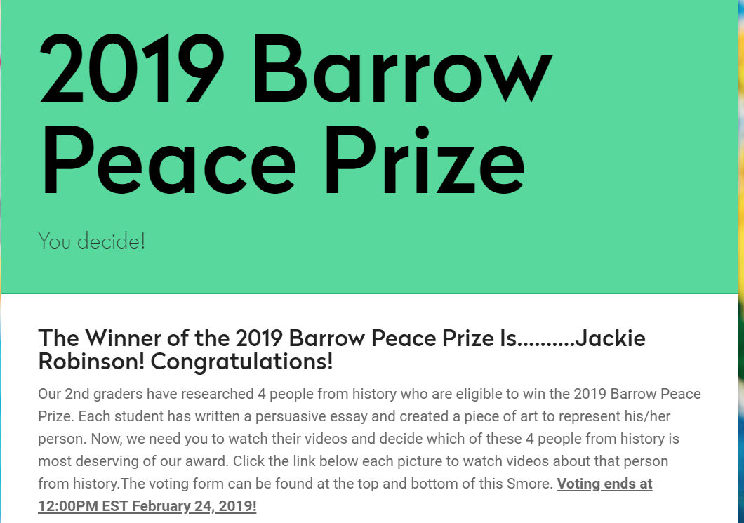 Published February 26, 2019 at 1060 × 745 in The Winner of the 2019 Barrow Peace Prize Is… 2019 Barrow Peace Prize Smore Newsletters for Education (1) ← Previous Next →