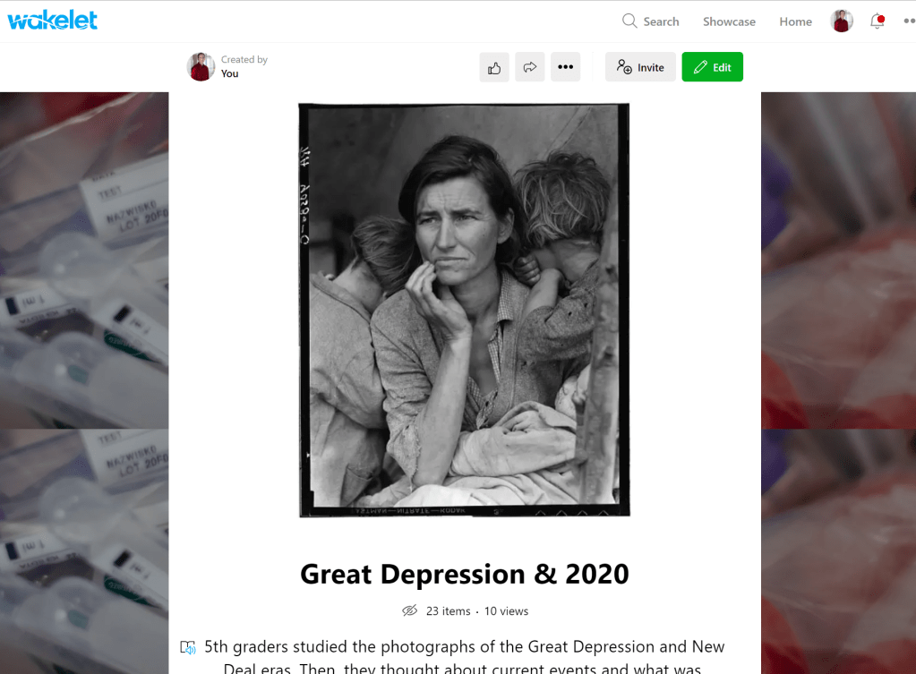 After this lesson, teachers offered Google slides templates for students to use to compare events of the great depression and today. Students could also choose to create their own slides or use a different tool for their project. They continued to use the Wakelet of resources to gather information and photographs for their projects.