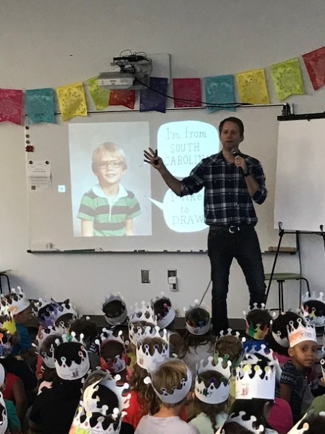 It has been a rainy week in Georgia, which means kids haven’t had recess in a while. Pair that with the full moon, and you have a group of high energy kids. We were already excited about our upcoming author visit with Nathan Hale, but this added an extra layer. If I had known what students were about to experience during the visit, I wouldn’t have worried at all. Nathan Hale is a top-notch author & illustrator and his school presentation is a sight to behold. I don’t want to give too much away about the content, but I will say that he had almost 300 high energy 3rd-5th graders laughing, gasping, and hanging on every word.