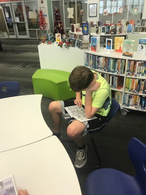 Before he left, Nathan took time to look at all of the comics that kids had made for the library windows. I loved that he took a moment to see how each one was different and what kids did with a blank piece of paper.
