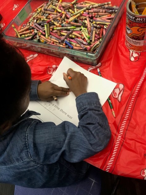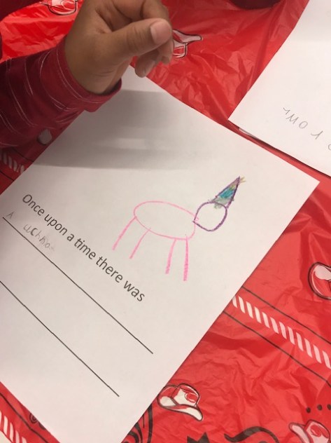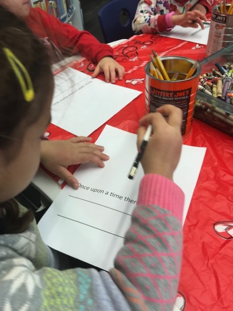 At this writing center, students put themselves in the shoes of an author and illustrator. Since our time was limited, we weren’t writing a full story. Instead, students finished the stem “Once upon a time there was….”. Students filled in whatever they wanted to as the author.
