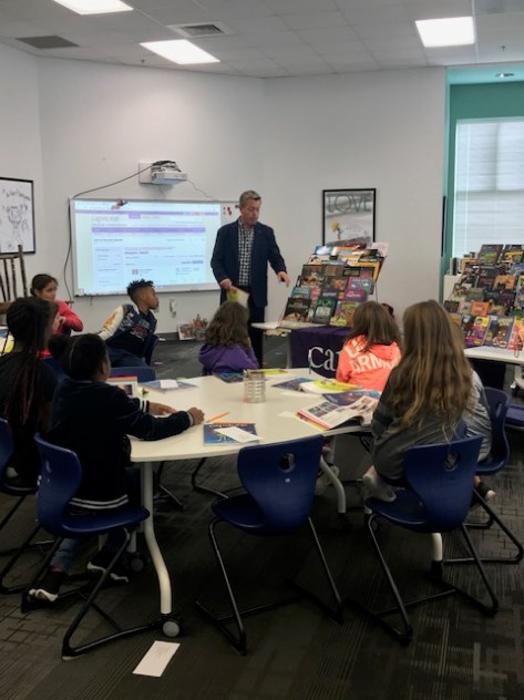 Jim arrived early and setup a display table of books. He divided his books into 2 displays: fiction and nonfiction. I put a catalog and list of goals at each chair. Typically, I meet with grade levels separately, but for Jim’s visit, I got permission from teachers to bring all students together at the same time. About 39 of our book budget students signed up to meet with Jim.