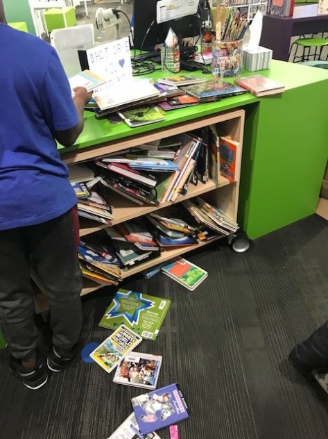 - students get in a frenzy of grabbing books off the shelves (a good problem) but as space opens up, entire shelves of books fall out in the floor multiple times per day.